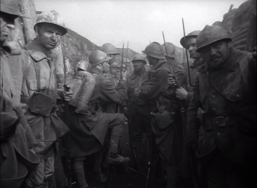 In the 21st Century, the First World War is not much fodder for movies. World War II has spawned plenty, but with the possible exception of The Thin Red Line, there may not have been a good American WWII movie since Patton. Recent wars in the Middle East have struggled to make a more interesting movie than The Hurt Locker (and recently have lurched into a weird, Ostalgie-type of hero worship with films like Lone Survivor and American Sniper). The Civil War is too distant and baroque for most moviemakers and more audiences. The Vietnam War is where the anti-war sentiment comes in, and (not surprisingly) where most of the good movies land as well. World War I has been hard to talk about in movies; the last good WWI flick might be 1962’s Lawrence of Arabia. Paths of Glory is, with all of that in mind, highly successful at displaying combat scenes and headquarters alike. The two could not be more different. Wide windows allow cool light into great rooms with rich furniture and high walls at headquarters; the front lines are cramped, either with low ceilings and little light, or with the great crush of men aligned on the front side of the trench where it’s safest from incoming shells. There is a war being fought by generals who are out of touch with the situation; even when Mireau comes to the front lines with his long coat and his crisp kepi, with a gallant scar across his face (which Kubrick always manages to keep in view), he is utterly unlike his men in dirty clothes wearing helmets. None of those men will get close enough to the enemy to get a scar so dashing as Mireau’s, presumably earned from a duel; most of those men will just get metal in their guts instead. Shelby Foote said that the bravest men in the Civil War were almost certainly the Union troops arrayed at Fredericksburg, who marched directly at the fortifications at Marye’s Heights, knowing, like everyone else in both armies not named “Ambrose Burnside,” that they would die and be no closer to taking the position. The Ant Hill is much the same; if the chance at a better command weren’t in front of Mireau, he would have absolutely rejected the assignment.