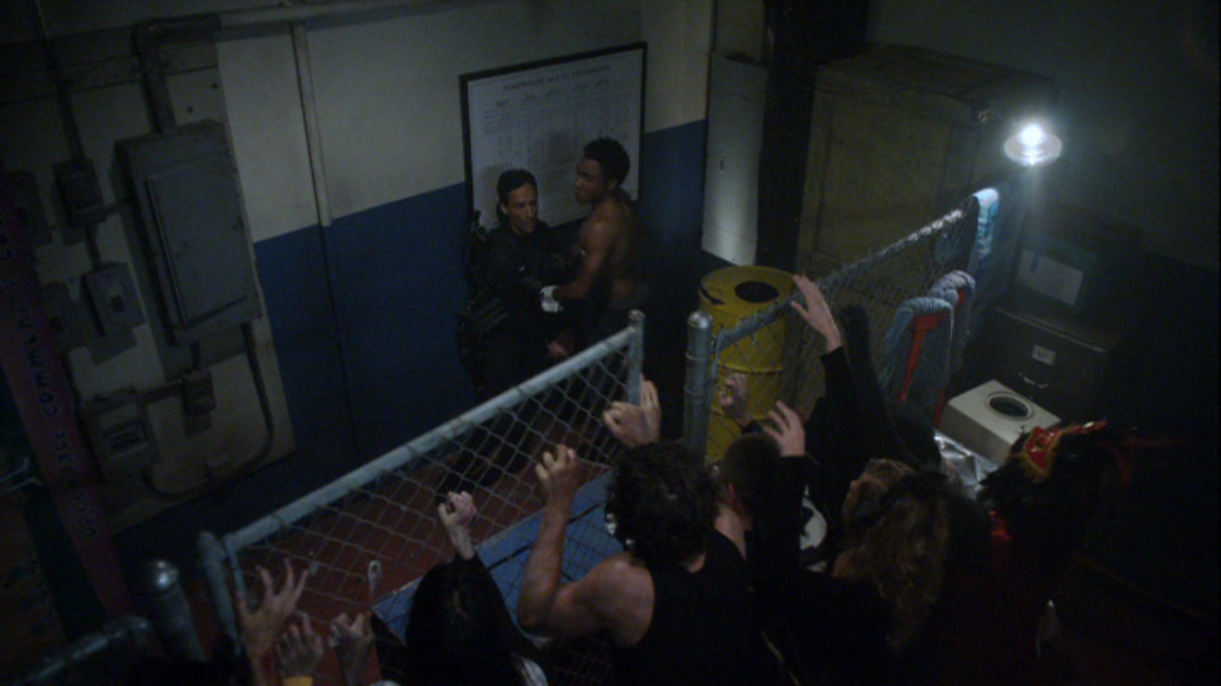 What makes the episode work beyond a series of allusionary punchlines is the fact that there’s a surprising level of plot buildup within this episode which, on the face of it, is 28 Days Later on a sitcom. Here’s the episode where Shirley and Chang, brought together by the fact that no one can figure out what their costumes are supposed to be, have sex in a bathroom and trigger a massive paternity scare for Shirley which is key to the rest of the season. Here’s the episode which asks Troy to make a choice between trying to be the cool guy or Abed’s fellow nerd. Even littler subplots, like Annie’s ongoing flirtation with Rich (much to Jeff’s displeasure) seem to pop up here. This episode isn’t any longer than the rest of Community’s output, but how it manages to squeeze all of those season-long plot points into this episode and still give a full minute to Jeff, Troy, and Abed tracking down an “insane cat” in the basement is nothing short of storyboarding brilliance.