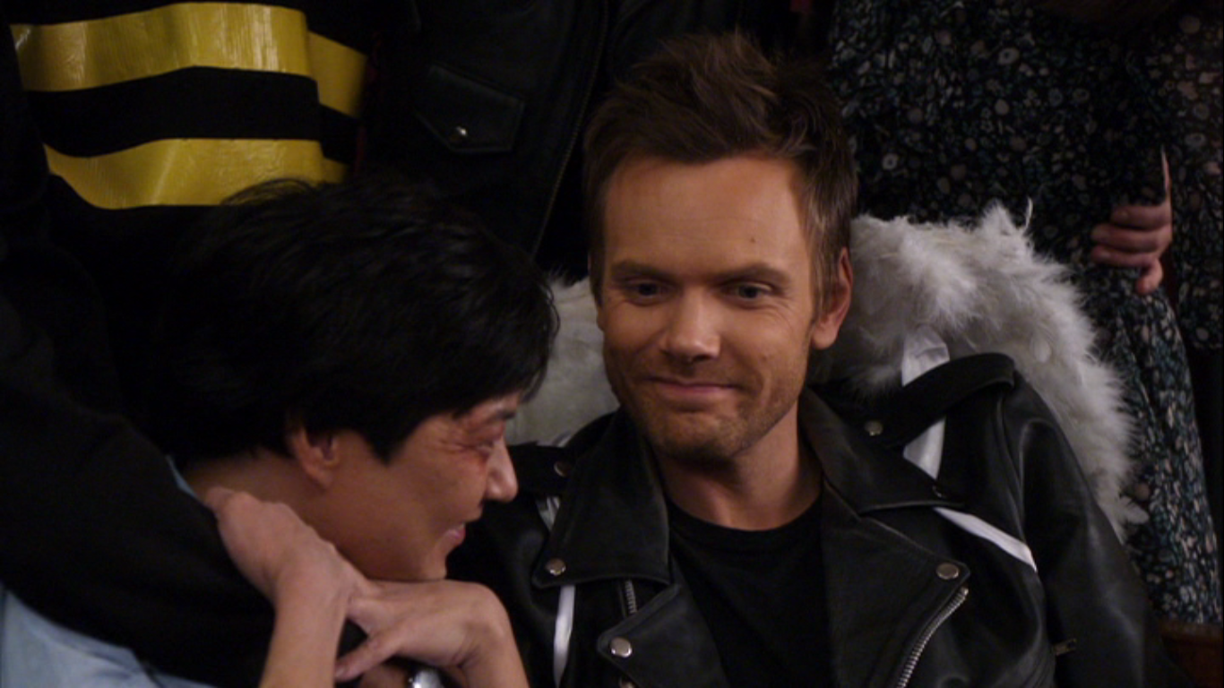 Every now and then, Community was willing to put Jeff largely in isolation against the rest of the group. That’s the formula they used in the pilot, certainly, and to some extent it shows up in an episode like Season 3’s “Remedial Chaos Theory” or the aforementioned “21st Century Romanticism.” “Accounting for Lawyers” puts Joel McHale up with Corddry and Drew Carey and lets the rest of the group run around him, either indulging on their weird chloroform misadventures or letting Chevy Chase or Yvette Nicole Brown drop one-liners. In some ways this is useful to reaffirm Jeff’s primacy; I like to think that these episodes are most useful in creating room for Jeff to be a person. Every now and then it’s useful to remember that Jeff is playing a character more than anyone else in the group; he’s forced to play himself a little bit less at times in this episode.