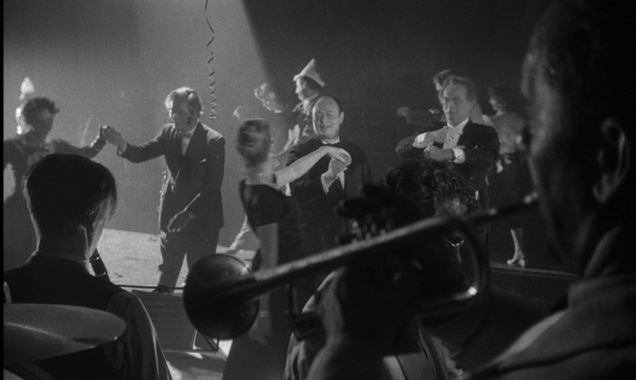 If there’s a former Home Army individual who’s capable of that kind of reprogramming, it’s Maciek. His friend and immediate superior, Andrzej (Pawlikowski), is older, more serious, and while “the cause” is as vacant a phrase for one as the other, Andrzej still feels himself duty-bound to carry out the orders of his own immediate superior. Maciek spends much of the film fingering or putting his nose in a small handful of violets that he’s pinched from Krystyna. Andrzej buys a similar handful of violets from some children on the street, hurries them off, walks ten feet to the nearest bin, and throws them away. Although no one says it, or even implies it, there’s no way that Andrzej can look forward to a peaceful death from natural causes. What Maciek and Andrzej have in common is their contempt of their fellow, Drewnowski (Bogumil Kobiela), who is nothing more than an opportunist. He leaves them immediately after “assassinating” the workers, running off at speed and showing up again at the banquet for the newly proclaimed minister for national health; he has gotten drunk, quite literally, with the hopes of his future career, and performs the essential role of the film’s comic relief. Not only does he show riproaring drunk, he stays that way, ultimately putting the fire extinguisher on the distinguished guests and doing a very bad job of that trick where you pull out the tablecloth but leave the dishes and glasses standing on the table. Drewnowski’s plan was to join the Communist regime that Andrzej will almost certainly die fighting; when he’s rejected by the Communists for his buffoonery, he tries to hook up with Andrzej’s unit again and is beaten up for his trouble. Andrzej is too serious to last long, and Drewnowski too clownish. Only Maciek, whose future plans are to lay low and be in love with a beautiful woman, has a future. He is mortally wounded in the dawn by Polish soldiers aligned with the Communists, living long enough to wander onto a trash heap stretching as far as the eye can see, writhing and moaning into his death. It is highly doubtful that the soldiers know who he is, or know that in the wee hours of the morning he’d successfully carried out his mission to assassinate Szczuka. Usually I’d complain about trying to squeeze that much symbolism into a single take (everything from the romance of the violets to Warsaw Pact Poland is up for grabs here), but there’s something especially lyrical in the way that Cybulski contorts his body, that the camera follows him across the trash until he falls, and then stays still while he kicks his feet and cries out. Maciek was doomed from the first time he grinned on screen as surely as Hamlet was doomed the first time he stepped on stage and whined. The point was never to know if they’d die, but how meaningless it would seem once we could reflect on the series of events that brought them low.
