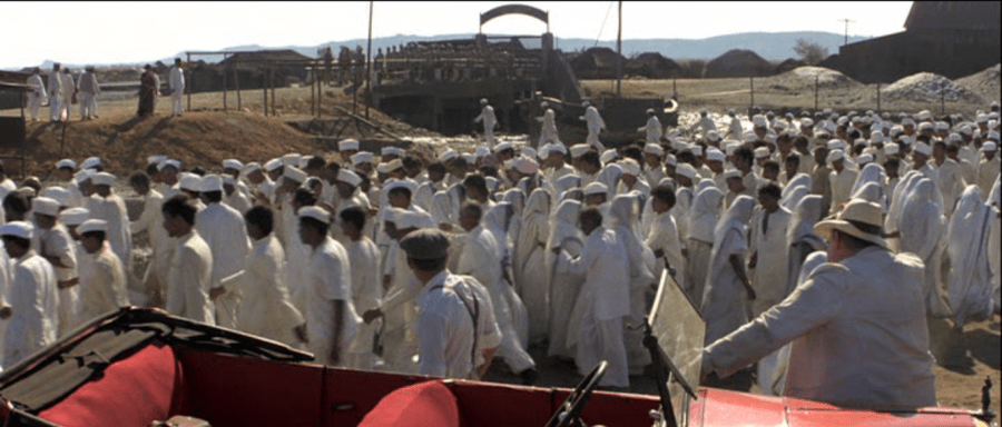 One of them is in South Africa, at the outset of Gandhi’s mission for better treatment of Indians in that British colony. Attenborough and his team very wisely begin with Gandhi in South Africa. Not only did the man spend more than twenty years of his life there, which must count for something, but the film wisely understands that Gandhi’s philosophy and administrative skills were given two decades of practice away from his Indian homeland. The film shows him, when he’s thrown off the train for being “at least one colored lawyer in South Africa,” as being largely ignorant of the prejudice which people of color have to deal with. When he leaves, he has become far more worldly, on top of having beaten Jan Smuts (Athol Fugard, which was like having Conrad Veidt play the Nazi bad guy in Casablanca) and at least two governments. Before he does all that, though, Gandhi has put together a meeting in response to a new law which has stripped all Indians of rights of legitimacy and privacy, as well as more firmly requiring them to carry government-issued passes. He whips up the crowd’s passions maybe a touch further than he meant to; in front of a British official and some soldiers, a few of them threaten to kill the first men who dare insult their wives by coming into a house unannounced and without permission. Gandhi is impassive when those men cry out, and when another man, later on, shouts that in prison they torture you. I am, Gandhi says, asking you to fight, and we need all of your devotion. But you will have to take blows, and bear broken bones and great indignities, and it will show the monstrousness of what your opponents have done to everyone, including themselves. (This last bit has never impressed me; maybe it’s the optimism of people who cannot countenance a world war.) He manages to bring the crowd’s support for his point of view to a clapping fever pitch, and then he brings it down again. “God save our gracious king…” he sings, and the rest of the room – British official and soldiers included – stands in reverence for the national anthem and for the monarch. In this gesture is touching honesty and cunning canniness. Gandhi always says in this movie that he petitions for the rights of any other citizen of the Empire, and he must mean it if he’s singing “God Save the King.” But it is devilishly smart to sing the national anthem; it’s much harder to be told you’re seditious when you’ve led a rendition of the national anthem in your political meetings.