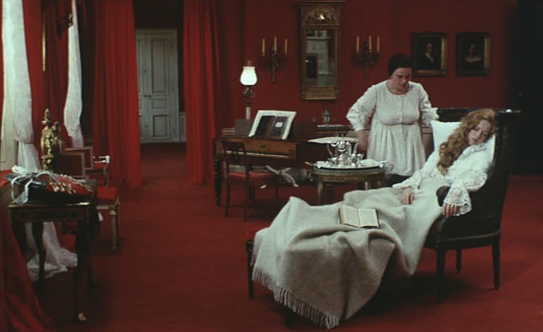 I’ve said before that “Vertigo uses green like the icepick the doctor uses to give you a lobotomy,” which I’ll stand by, but Vertigo also uses red to immense effect. Characters appear in both colors. Madeleine wears a long, flowing green dress when we first meet her against the background of Ernie’s, which is upholstered in a Nykvistian red. In Scottie’s apartment, he wears a green sweater while Madeleine wears a short red robe; Scottie rejects Midge when she’s wearing a red sweater in a scene which doubly emphasizes his reddish dreams of Madeleine. The first time we see Judy, she is in a strikingly green outfit alongside a group of friends in much dimmer colors. If green is the color of growth and increase and red the color of passion and violence, then these are fitting. While wearing green, Madeleine/Judy is irresistible for Scottie; he cannot take his eyes off her and Mulvey’s critique more or less comes true. (It’s worth noting that green, so associated with springtime and thus with fertility, is an added turn-on for the lonely bachelor.) While wearing red, as she does in his apartment, Madeleine is like a witness during the Spanish Inquisiton. While wearing the color of increase himself – having followed her green car around half of northern California by now – Scottie questions and interrogates and practically browbeats his impromptu guest wearing the symbol of passion. All this happens, presumably, after he’s gotten her out of her wet clothes and put her in his bed. Even Midge is not immune to the color coordination; she berates herself mercilessly when Scottie, creeped out by the painting of her head on Carlotta Valdes’ body, leaves her alone in her red sweater. It is her most violent reaction to anything in the film.