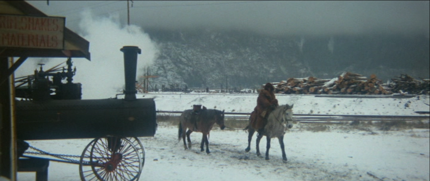To me, the most important thing is that it’s a western that has rain. Westerns are so arid; even in a classic western like Red River which has literal rain, the rain happens outside the action and the characters stay in tents. As McCabe rides up to the pseudotown of Presbyterian Church, it’s drizzling and from the mud all over the ground it looks like it’s rained more and harder in the recent past. How strange it is that people come in out of the rain, and then go back out into the rain, and work in the rain, and roll around in the mud after their whore has gone out of her mind and started stabbing him. Few Westerns feature mediocrities in the same vein as McCabe, but even fewer acknowledge precipitation. It provides McCabe & Mrs. Miller with character and individuality that other westerns simply don’t shoot for.