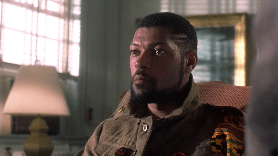 Dap (Fishburne) offers no reward, but in return the rules he plays by and expects others to follow are a little clearer. Give up all your fun and join in policies to convince some higher-ups to divest from the South African apartheid government, and you’re good with Dap. It’s unclear, exactly, what his reward is for doing so. Dap is clearly passionate about his movement, and yet much of it is clearly performative. He dresses in outfits which speak to his pan-Africanist sensibilities and spends much of Friday wearing a “Soweto” shirt. He seems to relish being in charge of the divestment group on campus, so much so that he doesn’t have ties to any other similar movements on other campuses. He has a long-term girlfriend, Rachel (Kyme), although Rachel openly wonders if Dap isn’t dating her because she’s dark-skinned. Dap denies it, but he is also vocal in his opinion that most light-skinned African-Americans are “wannabees.” The only light-skinned person he seems to respect at all, interestingly, is Julian; he believes that there is a smart person underneath the frat brother persona. Indeed, Julian even has an opinion about the unifying position that Dap has, which is that he’s going to try to identify more with his fellow Americans than with people thousands of miles away that he has nothing in common with.
