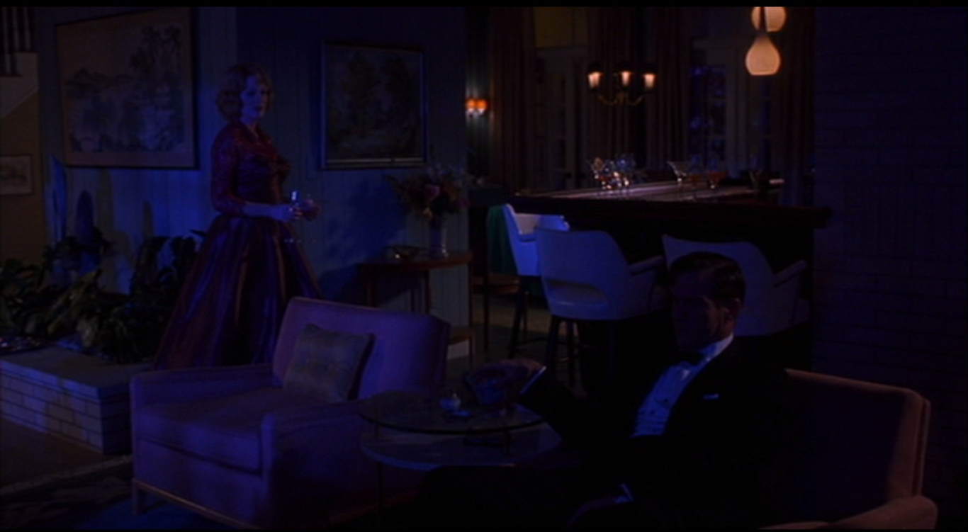Frank and Cathy Whitaker are the faces of the television company Frank is an executive at, Magnatech. They are recognizable from the advertising, and why shouldn’t they be? Frank is rugged and handsome, and Cathy is perpetually radiant. It’s a fact frequently commented on by their friends, who delight in saying “Mr. and Mrs. Magnatech.” But there’s as much falseness in that chirpy little phrase as there is on the television set itself. (No doubt Haynes recognizes the irony of updating All That Heaven Allows, which starred a gay man playing a straight man, with a straight man playing a gay man.) Frank’s homosexuality is the first issue the movie deals with, and Far from Heaven is not kind to the past. Dr. Bowman (a clammy James Rebhorn) is generous but firm with his new patient. Cathy is supportive – much too supportive for Frank, who wants to “get better” simply because it will save him a great deal of humiliation. His behavior becomes erratic; he drinks heavily and unabashedly in public and begins to verbally and then physically abuse his wife. Cathy bears it with as much grace as she can, though it’s this change which moves her toward Raymond. Frank backslides before the end of the movie, eventually running off with a young man he meets in Miami. His character is perhaps unique. I can’t think of another explicitly gay movie character living in the 1950s who gets to be gay and lives; Frank is Mr. Magnatech, not some sissy in wardrobe, and he leaves his wife and children in the late prime of his life.