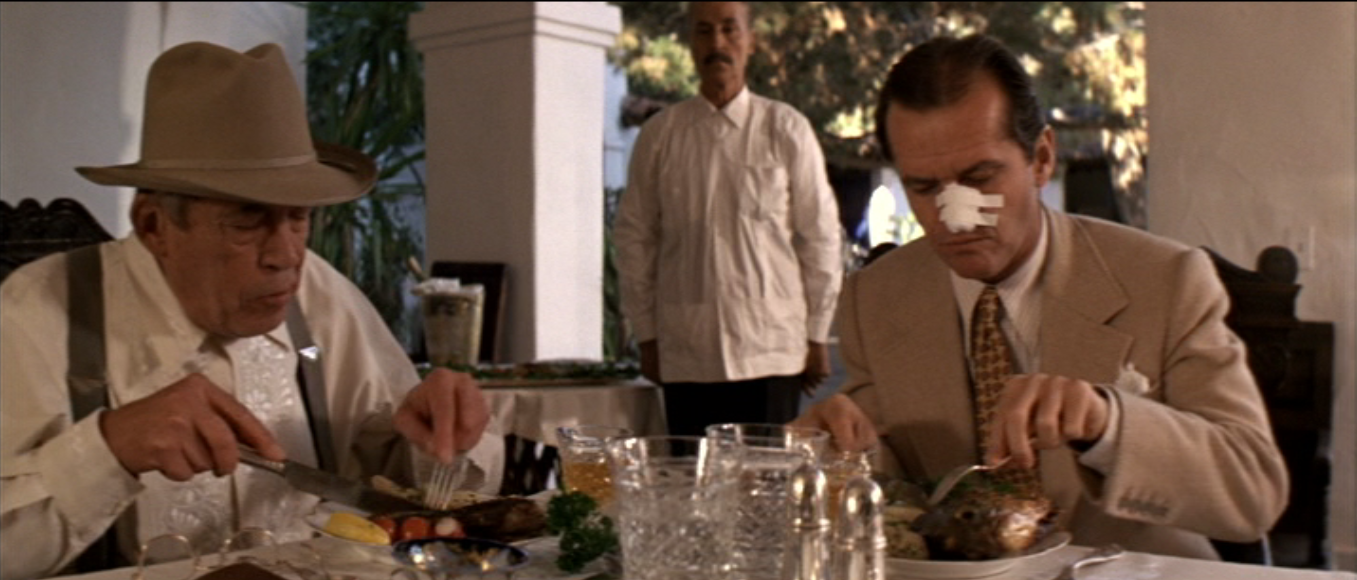 Perhaps no villain in a film noir has ever been quite as frightening and loathsome as Noah Cross, who is (deep breath) a refined, rich rapist. It’s the first quality that is most offensive, really; we simply feel better with villains if they slaver a little, and Cross appears to be in control even when he’s been shot. Once Gittes has figured out most of the pieces to the puzzle, he asks Cross how much he’s worth. He plays dumb, but eventually assents to about ten million dollars, which is a fabulous sum in the late ’30s. What do you want that you can’t buy with that kind of money? Gittes asks. What do you need it for? Cross’ answer is chilling, especially when paired with our own knowledge (and Towne’s and Polanski’s) of what would follow when the rich got richer. The future, he bellows. He wants nothing less than the future, personified by the teenager who is both his daughter and granddaughter. In the last minute of the movie, he drags her out of the car away from the corpse of her mother/sister, covering her screaming mouth with his giant hand. “Forget it, Jake, it’s Chinatown” was always a coded message; in America, the biggest checkbook tends to lift the most weight, no matter how strong the pull of Hell is to its holder’s soul.