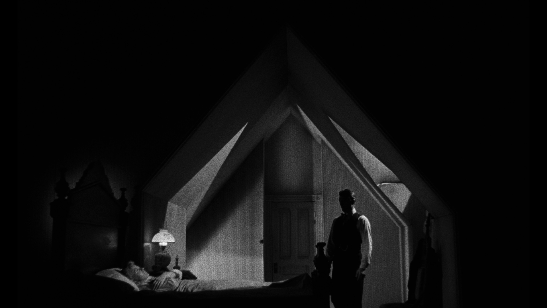 Some of the best shots in The Night of the Hunter are unusual and ambitious, especially for a first-time director like Laughton, but their success makes the movie all the more unsettling. The bedroom Harry and Willa share is shot from a distance so that it looks like some small annex in a Gothic cathedral. John and Pearl, hiding in the basement from their stepfather who is no longer shy about threatening them with maiming and death, disappear in the darkness. From a distance so great it must be outside the house, we see Harry slowly descend the stairs, impossibly small in fact but simultaneously appearing larger than life because of the shadows. I’m fond of a scene where John, looking out at the moon from a hayloft, sees the small shadow in the distance of a man on a horse. He’s singing “Leaning on the Everlasting Arms” with a clarity far greater than John’s ability to see him. The moon hangs low, too, when the children get into a skiff together as Harry is trapped momentarily by the deep mud, giving them a chance to float down the river away from the monster following them. Eventually, the children are adopted, more or less, by a kindly old woman named Rachel (Lillian Gish, a full forty years after she rocked the cradle in Intolerance.) Yet even in Rachel’s loving and firm care, those strange shots keep coming. Downtown, the shadows veer in every direction; in Rachel’s house, she waits for Harry to come after the children while she and her rocking chair and her shotgun are silhouetted. A great actor like Laughton recognizes that providing the proper emotion in a phrase like “the time is out of joint” is important, and as a director he creates the proper atmosphere as well.