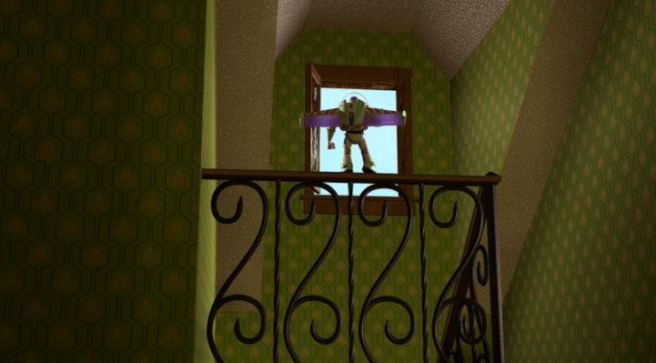 Woody and Buzz have accidentally been taken by Sid, the sadistic kid from next door who delights in mangling his own toys. Another Randy Newman song plays over Buzz trying to do something heroic (“I Will Go Sailing No More”), this time trying to fly out of a window after watching a commercial for Buzz Lightyear action figures. It ends badly; his arm breaks out of its socket. Later on he will be duct taped to a firework rocket, a death sentence that he only very narrowly avoids. It falls to Woody to motivate Buzz back into action, and here Woody makes a confession that burns him deeply: Buzz is a “cool toy,” and Woody should be strapped to that rocket instead. This would be the shining moment of the movie if not for the brilliant elation which closes the film’s climactic scene. Having chased a moving truck as far as they can, Woody lights Buzz’s rocket; Buzz manages to break out of the duct tape as the rocket explodes above them, and while holding on to his new friend, Buzz falls with style, gliding through a crisp blue sky. “To infinity and beyond!” Woody cries in his elation; his elation is ours, too.