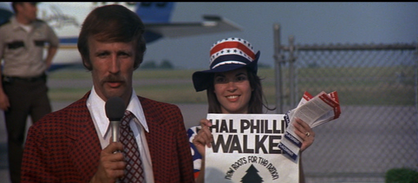 Part of it is Blakley’s appearance that sells the song, her acting when she’d never acted before. She has a willowy, delicate frame anyway, but in the white dress she’s never seen out of, with giant bows in her giant hair, there’s a sense that this is a barely grown up little girl in a costume. (Allen Garfield plays her browbeating husband and manager, Barnett, whose interactions with Barbara Jean certainly infantilize her.) Yet she has this wonderful voice, and while she’s singing she has the quality that people love Adele for: she looks like someone is ripping her heart out. During “Dues” she appears to be near tears, and everyone is just spellbound in the audience. The best musicals – and Nashville is one of them – recognize that their songs are a way to develop character without relying on dialogue or action. We learned that Haven is old-fashioned and homey to the point of caricature, that Connie is simple in the meanest sense of the word, that Bill (via “I’m Easy”) is attractively spellbinding but emotionally vacant. Barbara Jean, we find out, is filled with emotions that consume her all the time. Singing is this marvelous cathartic act for her as it is for many of us; it’s the only thing that keeps her mind focused and her words sane. As it is, at this performance she has the beginnings of a nervous breakdown and has to be pulled off stage. The crowd has paid for Barbara Jean and isn’t sympathetic; Barnett has to volunteer her as the latest star performing at a political concert in favor of presidential third-party dynamo Hal Philip Walker. (Walker is, and I hesitate to use this word in the present time where the media has endeavored to make it meaningless, a populist. He believes in abolishing the Electoral College, taxing places of worship, changing the National Anthem so that it means something, eliminating all lawyers from Congress. I mean, I get the appeal. So does a reporter on television, who seems to have Walker on the brain just as much as the nameless youth of Nashville do: “Christmas has always smelled like oranges to me.”)