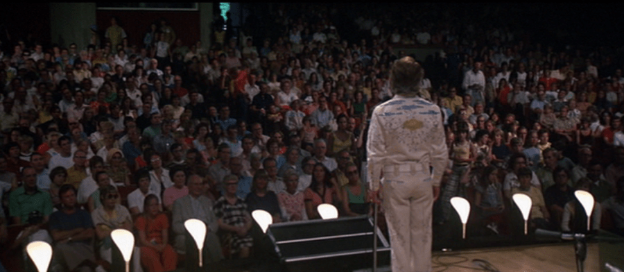 As the musical portion of the program continues, the sadness in the movie begins to pile up. Sueleen Gay (Gwen Welles), a curvy waitress with aspirations of becoming the next Barbara Jean, is picked up to perform at a big-donor benefit for Walker. She sings so badly that your dog would run away, though, and in the end she is cheered and bullied into stripping for the donors. It is one of the most painful, uncomfortable scenes in a movie I’ve ever watched; out of the many times I’ve watched this movie, I’ve probably only watched this one two or three times. Sometimes I’ll fast forward, or do a quick chore, anything not to watch something that shameful and embarrassing. (Altman is not frequently given as a director who was particularly thoughtful about women, but movies like Nashville and Thieves Like Us and McCabe & Mrs. Miller are definitely concerned with how women really struggle in a man’s world.) Delbert is taken with her in the way that he he isn’t taken with his wife, nor his two deaf children, who are charming. (Linnea’s character is based on Louise Fletcher, whose parents were deaf; Altman, in a frankly nasty move, cut her out of the movie after collecting the story. There’s some consolation for Fletcher, though, who took Nurse Ratched in One Flew Over the Cuckoo’s Nest instead and won Best Actress.) Wade makes plans to move to Detroit, but Sueleen, who cares for like a father, refuses to go; Delbert has promised she’ll sing at the Parthenon with Barbara Jean. Mr. Green (Keenan Wynn), a gentle old man whose niece, Martha (Shelley Duvall), has come to town ostensibly to see her sick aunt, becomes a widower. Martha (going by L.A. Joan and wearing about a million different wild outfits) never does see her aunt; Wynn’s sadness, followed by his determination to get Martha to pay her aunt some final respect, is the most explicitly ’70s aspect of the film. Altman, funnily enough, does his best to move our pity and our feeling to the old generation, not the new one. Linnea finally goes to bed with Tom, who’s been calling her house, but gets dressed in the foreground while we hear Tom calling up the next woman from the other room. She lets the door fall behind her. “No, it’s just the maid,” Tom says. It’s a miracle that this works – part of it must be Tewkesbury again – but the movie manages to repeat this message of despondency or heartbreak over and over again because each character, even if we’ve only seen them for a relatively short amount of time, holds our sympathies. In practice it’s almost unbelievable, but then again, why shouldn’t it be when director and editors and actors and writer are all so unified?