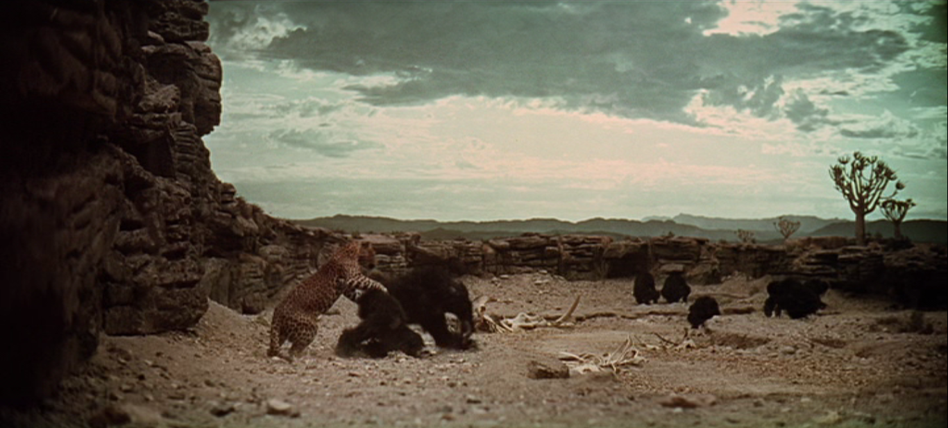 2001 has a reputation for coldness, for machinistic progression; there’s a perception of the film that seems to think it denies or sneers at feeling. And while the characters in the movie don’t, for the most part, crack jokes or smile at their families or have sex or anything like that, that doesn’t mean that the audience doesn’t have its own mind. I run through a gamut of emotions watching 2001, partly because of the stoicism of Keir Dullea or Gary Lockwood or William Sylvester. Dave and Frank’s coolness about shutting down a computer which seems to have not merely a mind of his own but a sense of himself always fills me with a little indignation; the seemingly unfeeling eye of Hal’s console after we see Frank’s body float away through space, at first tugging and waving and then slowly but surely fading into the slow push of the laws of physics, is chilling. Heywood Floyd calls his daughter up on the 2001 version of Skype and, even though he is missing her birthday party, even though she is just a little girl, never says “I love you,” and it always hurts me a little. Floyd and his fellows en route to the Moon and then on the surface of it never look out the window, which is either a familiarity or a callousness which stuns me. And so on and so forth. The phlegmatic characters might have cold hands, but there are certainly elements of 2001 which suggest that a viewer should react warmheartedly, open to the vast possibilities that the movie opens to us. The Stargate is wondrous, and so is the moment when Moonwatcher, just idly fooling with a shinbone, discovers that it has utility.