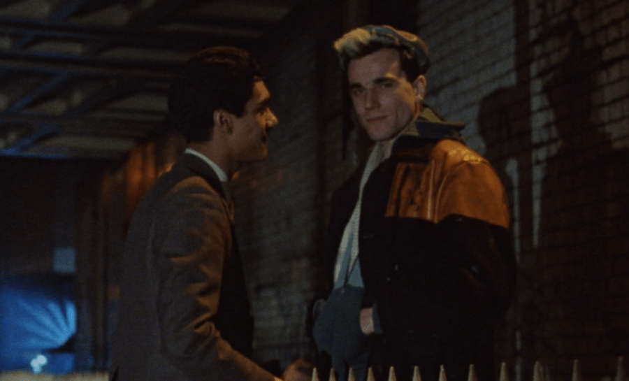 At any rate, if there’s a literary figure for Johnny, who is no fool but has no serious education, it’s F. Scott Fitzgerald. I’m not saying that simply because I read Fitzgerald into everything, either; he sees in Nasser, whose driveway is constantly full of cars and whose manor is constantly full of clingers-on who wouldn’t come if their host wasn’t so wealthy, Gatsby. At another moment, he wryly turns Omar’s words around about a ritzy laundrette to invoke, “A laundrette as big as the Ritz.” Fitzgerald’s boys who come into wealth never seem to put their whole hands around the gold nuggets; they find a nice girl and discover that she’s too classy for them to aspire to. At the end of the movie, the beautiful laundrette has taken trash cans to the clean, beautiful windows; like Dexter Green or George O’Kelly, Johnny is bossed around by Omar, who is as capricious as Judy Jones or Jonquil Cary. Both Omar and Hussein remember Johnny as a young boy and also remember his transformation as a racist thug. It’s not brought out what’s changed Johnny, who is implied to have a violent past. He is often photographed in a more submissive position compared to Omar, which is unexpected if for no other reason than Day-Lewis’ mien. The hair is not threatening or tough, precisely, but he’s constantly in a leather jacket and moves people without much trouble. He tells Omar, Nasser, and his onetime running mate Genghis (Richard Graham) that he’s not interested in fighting or foul play. He cannot avoid physical confrontations on behalf of or with all three of them.