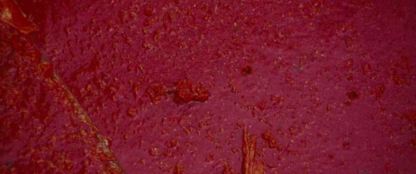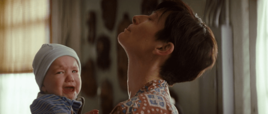Even in this moment of joy for Eva, who is a respected travel writer, we see her covered with pulp and raised up in that all-too-familiar crucifix shape by some of the young folks of Bunol. Eva is lit with red frequently in those first thirty minutes, or otherwise covered in it, and we must fold in the excesses of La Tomatina with the redness which envelops her. She’s living in a small house by herself and someone has smeared red paint all over the facade and on the windshield of her station wagon. The red comes in through the windows, and when she tries to sand it off it gets on her skin and clothes. Red is an accent color just about everywhere throughout the movie, and Ramsay hits on it successfully maybe seventy-five percent of the time. This is a much higher hit rate than the vast majority of directors would be able to manage, I think, but it speaks to how difficult red is to use as a primary tone-setter in a film. Too much of it and it feels forced, as it sometimes does throughout the movie. Watching Eva roll the red ball to Kevin is effective, as is the red jacket Kevin (played as a teenager by Ezra Miller) wears in one scene, as is the ketchup Eva takes with her eggs. Bathing Eva in it, whether through sirens or the paint on the windows, works occasionally. In truth, I’m not sure Ramsay uses red enough: she might have made more of a success of it if she’d gone full Cries and Whispers.