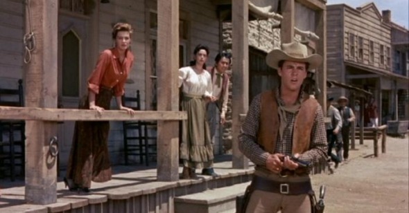 The willingness to accept a suicide mission is strong enough among all the men Chance comes across who aren’t being paid off to kill him. Despite Chance’s frequent and strident dismissal of help from outside the constabulary, he depends very much on others to help him. When Colorado (Nelson) refuses to help him the first time, prudently choosing to stay out of an armed conflict, Chance writes him off. Yet Colorado saves his life with some quick thinking and a little help from Feathers (Dickinson) throwing a well-timed potted plant through a window. Carlos comes to Chance’s aid during the climactic gunfight with his own shotgun and a box of shells. Stumpy, despite being told to stay behind at the jail because he can’t move, comes to the fight anyway and has a pretty explosive set of contributions. In short, it appears that Chance has managed to inspire the normal folks around him to action in just the way Will Kane didn’t. (As I understand it, the subtweet of High Noon is a major part of the subtext of Rio Bravo, which is sort of like reading about the Twelve Labors of Hercules and complaining about the physics of Hercules’ strength.) As much as any western I’ve come across, Rio Bravo is formulated to uphold myths of the winning of the American West; it seems to earnestly believe in the ability of a strong leader to overcome all obstacles. Three years later, John Ford would debut The Man Who Shot Liberty Valance, another John Wayne-fights-crime western about how the winning of the American West was always fraudulent. Liberty Valance is far more satisfying than Rio Bravo in that sense; it’s not high on its own musk in quite the same vainglorious way.