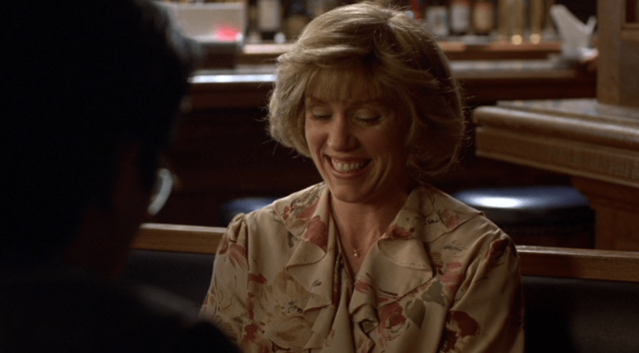 Ebert argues in his first review of Fargo that Mike Yanagita (Steve Park), whose presence is nothing if not surprising at that juncture of the film, functions as a bridge from Marge Gunderson’s disinterest in Jerry as a suspect to figuring that his role in the drama is much greater than anyone suspects. He’s right, although I would add that the scene is essential in reinforcing, at a crucial moment, the influence that Marge has on people. She elicits reactions from just about everyone in a movie where other people have a really hard time getting anyone else to pay attention. Carl fails to get Grimsrud to heed him, and later on can’t sway Shep (Steve Reevis) from his plan to beat the heck out of him. Jerry might as well be speaking gibberish to Wade and Stan Grossman (Larry Brandenburg), who know that Jerry is a screw-up by nature. That effect that Margie Gunderson has on everyone – to grab their attention and hold it – is not such a bad thing for a cop investigating a triple homicide with few clues to go on short of “funny-looking guy” and “tan Ciera.” Her husband adores her thoughtlessly, which is really a lovely thing; Norm (John Carroll Lynch) exists to support his pregnant wife, mostly with food. “Gotta have a breakfast,” he says a few times as he rouses himself to make her eggs while she goes out early. (The Coens have this brilliant script in about a hundred different ways, but I enjoy the way that they seize on a single phrase – “I’ll make you some eggs,” “We’re not a bank, Jerry” – with the same kind of catechismic gusto that the folks behind Escape from the Bronx seized on “Leave the Bronx!“) He brings her Arby’s at the station. The two of them have a giant buffet lunch before she heads out to Minneapolis. The hookers invest a blissful sort of trust in her. Mike Yanagita , arguably the most fascinating person in the movie, is utterly smitten with her fame and her sexual potential. Others might have given McDormand that Best Actress statuette because of a line like “He’s fleein’ the interview!” or “There’s more to life than a little money…don’t you know that?” To me, it’s her mixture of polite grinning and quietly sublimated terror that sells the scene. She makes the difference between telling Mike in no uncertain terms that he needs to sit on the opposite side of the booth, then trying to save his feelings by saying she doesn’t want to get a crick in her neck looking at him, and finally keeping a look in her eyes which is far more creeped out than she gets watching Grimsrud sticking Carl’s leg into a woodchipper.