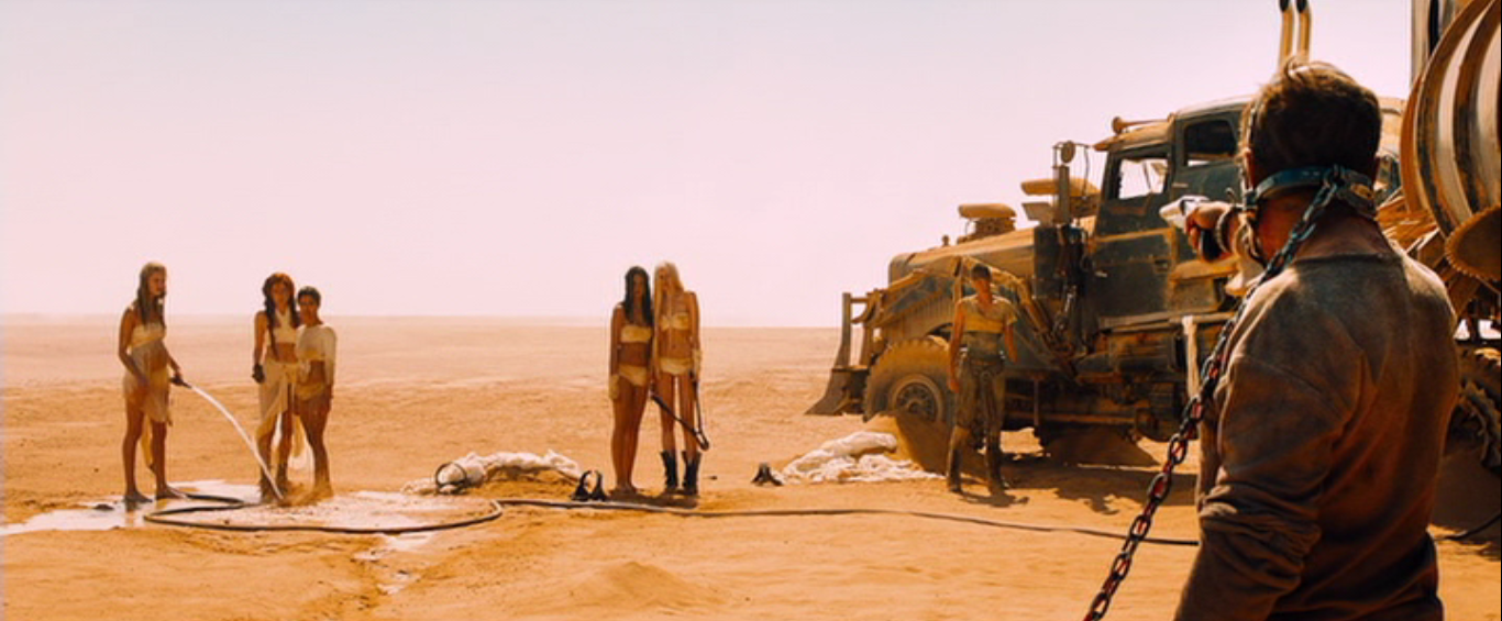 When you’ve decided to let images rather than dialogue run the story in your movie, then you’ve opened up a really fascinating door to using words as ambience. Words are ambience fairly often for Paddy Chayefsky, Aaron Sorkin, Diablo Cody, and other name-brand screenwriters. (Unsurprisingly, the best those writers look are in movies which can carry in ambience from outside the words: Network and The Social Network and, well, I’m still waiting for a really good Cody movie.) The disadvantage is that the words are doing double duty in that case, since they have to move the story and explain it while it happens, which is one of my hang-ups with Sorkin television shows; the walk-and-talk is famous, but there’s nothing beautiful or moving about a tracking shot under fluorescent lights. In Fury Road words have no such boundaries, and so they are part of the scenery. In our first encounter with Nux, hooked up to his “blood bag,” he shrugs off his friend, Slit, who says quite rationally, “If you can’t stand up, you can’t do war!” Nux’s reply is one for the ages, even though it sounds like dialogue tapped from a Tom Clancy video game. “If I’m going to die,” he says, “then I’m going to die historic on the fury road!” It’s a line which teaches us as much about Nux as the image of him eating a bug off of Capable does. It does not have to be thick with meaning; all it needs is to be shoutable, and if it favors an adjective instead of an adverb to sound cool, then I’m all for it. The religion, such as it is, of the War Boys is simple enough. Die in combat and go to a special warriors’ heaven, aptly named Valhalla. Most of Nux’s lines in the first half of the movie, before he puts his chips in with the wives, reference Valhalla in some way, either specifically or via the ceremonial action he cannot complete. We find out that one spraypaints one’s mouth silver (“shiny and chrome!”) before committing some violent, destructive suicide; others “witness” the event. There is no Bible for the War Boys, no fanservice for moviegoers who want to see what they already know. This is new and comprehensible and a little ethereal, just like the majority of the dialogue in the first half of the movie. Or maybe it’s mostly a boy problem.