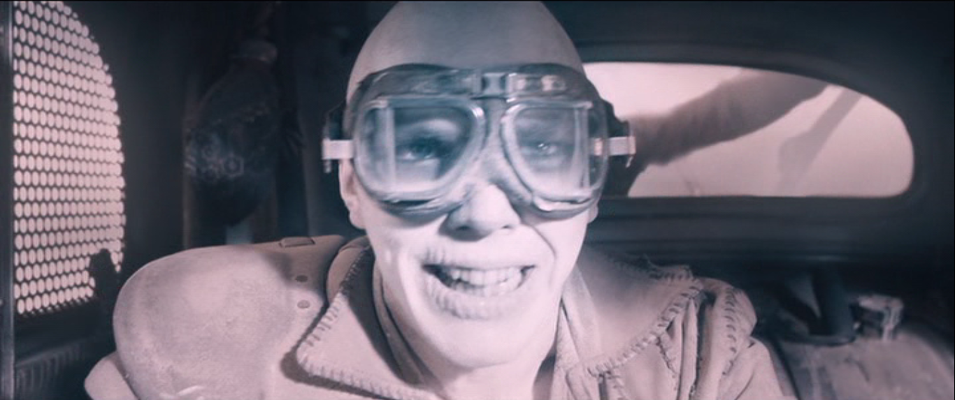 Where many movies would try to explain themselves immediately after such a visceral start, Fury Road does not. Immortan Joe (Hugh Keays-Byrne) and his strange sons are introduced, although we know nothing of them short of the command positions they hold and the poor health most of them seem to be in, including the Immortan himself. “Aqua-Cola” is released from great pipes onto a filthy, mutated crowd of skin-and-bone people. Charlize Theron has a boy’s haircut and black grease covering her face from eyes to hairline. By my watch, Fury Road takes a good half-hour to even begin explaining itself; it’s not until the wives appear that the story adds some oxygen to its atmosphere, at which point we start suckin’ it down like the Immortan himself. Before that point, we’ve gotten some sensational car chase footage and sequences that are just unparalleled; even little moments where the cars don’t matter, as when we get a medium shot of the Immortan driving and then an immediate cut to close-up, are stunning. The first time I saw Furiosa run the war rig into a car to send it into the vortex – upon which it explodes, of course – I was stunned. I’m still dumbfounded by that sequence, which is underlined with orchestral music totally different from the tone that the Doof Warrior and the drummers set a few minutes back. It’s enough to make you agree with Nux: “What a day!” What a lovely day!”