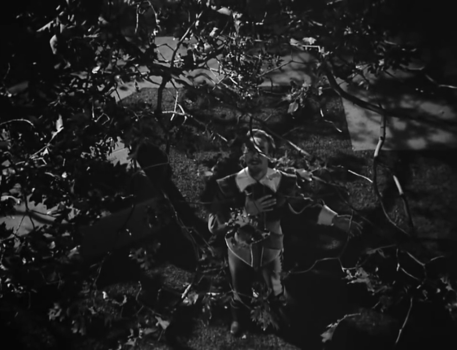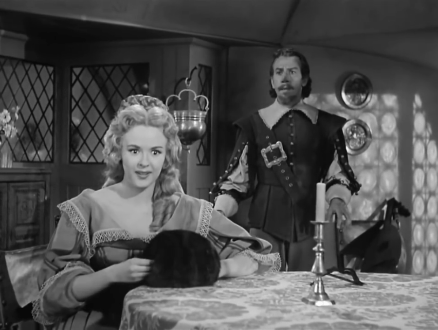 In an age where any artist or poet or playwright has a patron who pays him for the price of altering little things here and there, Cyrano lives entirely off his salary as a soldier. Cyrano is noted for ardent words no matter what the topic, but of all the deliveries Ferrer packages in this film, I think I prefer his response to Le Bret (Morris Carnovsky), his best friend and most frequently ignored guardian angel. Should I eat a toad every day? Cyrano asks him? Should I prefer a visit to a courtier to a poem? Should I crawl on my belly for these people? “No, thank you!” he says, “No, I thank you! And again, I thank you!” The Comte de Guiche (Clanton), nephew to a nameless cardinal with a suspicious resemblance to Richelieu, is the type of insufferable, spineless, and privileged man who Cyrano would presumably be eating toads for. It’s hard not to sympathize with Cyrano, who is so aggressively his own man in an age where everyone is very publicly owned by someone else. Perhaps we wish that he’d take Le Bret’s help when it’s offered, as when the baker Ragueneau (Lloyd Corrigan) gets himself in trouble with de Guiche, is threatened by a dozen armed men, and comes to Cyrano for assistance. On the whole Cyrano’s risk-taking is exciting, and it’s part of what makes him exciting to watch. The film takes care to show us Cyrano’s prowess as a swordsman and brawler, adding in some sword fights where the play restricts itself to a modest curtain; these are meant to be exciting, one imagines, although even in 1950 one has seen a hundred filmic duels. Ferrer does not shine in these moments, although there’s some question in my mind if that’s actually Ferrer fighting off the men on Ragueneau’s behalf. His vocal risk-taking, as in the endlessly reiterated scene where he speaks to Roxane (Parsons) as Christian (William Prince) from beneath her balcony, is more enjoyable. Chances for improvisation are what draw us in.