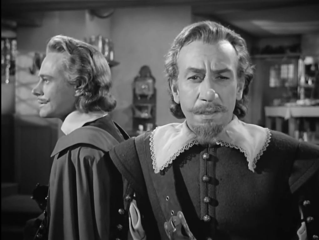 Cyrano de Bergerac is a really tricky play to adapt, more or less as is, from stage to screen. The 1950 edition is sad proof of that difficulty. The play itself is filled with monologues and excessively verbose language as well as a setting which, to most American viewers then as now, is completely arcane. (The reign of Louis XIII is not discussed with much fervor in the average high school world history course.) The hero is renowned for his swordplay but is given much more room in the play to use his words as a weapon of war or of love. Roxane and Christian, his beloved cousin and his romantic ally and rival, respectively, are not interesting people. They are like reflecting pools for Cyrano, who lives to imprint himself on everyone he meets in one way or another. The plot itself turns, a little surprisingly, on a war between the French and Spanish, and then ends in another short act fifteen years after the first scene at the theater. In other words, straight adaptation is tough, and there’s a reason the Steve Martin vehicle Roxanne is such a delight where Cyrano de Bergerac can be sort of a slog. (I love Cyrano. It is one of my favorite plays. Something about it does not translate well to film, which puts it in pretty good company: Death of a Salesman, The Glass Menagerie, Les Miserables, Equus, etc.)