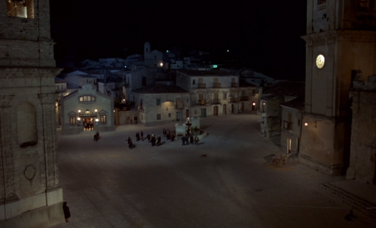 What makes Giancaldo different than the average hamlet in a movie like this is how its inhabitants treat it as a living symbol for the past. Both Alfredo and Salvatore’s mother, Maria, refer to the town as a kind of ghost. When he returns to Giancaldo and discovers during Alfredo’s funeral that the Nuevo Cinema Paradiso has been closed for six years and will be torn down in the near future to make room for a parking lot, that ghostly character gains immense vitality. To me it is every bit as sad as the supercut ending or the scene where Elena and Salvatore realize that they almost literally lived out “ships that pass in the night.” Salvatore can see Toto in the peeling wallpaper and chairs piled up in the middle of the room; the receipts for each movie delivered haven’t been moved from the walls, and when he tears the room apart looking for the one that Elena said she wrote on, the dust flies and the paint behind the receipts is a different color from the rest of the wall. He cannot stand with the crowd when the old building is brought down; he stays further back than the rest. How many ghosts were released into Giancaldo that day is unknowable, but no doubt John Wayne and Silvana Mangano and Antonio Arcidiacano and Yvonne Sanson and Charlie Chaplin were all there, infiltrating the dust and stones, released from the building that once kept them.