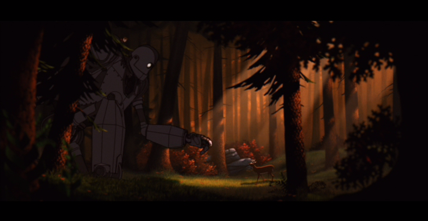 The rate at which the Iron Giant (Vin Diesel) learns to feel is one of the pleasant surprises of his movie. Teaching him how to talk and what to eat and what not to eat is more charming on paper than it is in practice, even though I think it does a good job of showing us what Hogarth (Eli Marienthal) is like when he finally gets to interact with someone he considers a friend. Our first real indication of his emotional intelligence comes when he learns that the character most like him in the comic books that Hogarth adores is a villain; he doesn’t like villains. He likes Superman. Hogarth convinces the Giant that he can be what he wants to be, a lesson that the Giant takes to the heart he’s developing. Despite the fact that he is a weapon as deadly as any atomic bomb that the United States (or the Soviet Union) might be able to wield, he comes to a point where he does not care to unleash his arsenal even in self-defense. Dean (Harry Connick, Jr.), the erstwhile beatnik whose destiny in life is to run a junkyard, chews out the Giant (who needs metal for sustenance) for chewing on one of his pieces of scrapmetal sculpture; the Giant, kindly enough, refashions the piece he’s been gnawing into an attractively floral work and sets it down for his new benefactor. When he accidentally halves the amount of water in a small, cold lake that Hogarth is (unwisely) swimming in by doing a cannonball, he seems to take Hogarth’s cue that he’s done something kind of goofy; bless the animators who turned the Iron Giant into someone who could be physically silly enough to get along with a preteen boy. The most magical step on the Giant’s emotional journey, and of course the saddest, is the deer he makes friends with. The deer is nervous but doesn’t bolt; it sniffs the Giant’s huge fingertip. Certainly it must have sensed, as animals can sense, the kindness in the strange colossal form in front of him. And if the Giant could have cried, he would have when he saw the deer’s corpse moments later, shot down by a hunter. I suppose this is why the first thirty minutes or so of the movie seem almost totally removed from the rest; those are so cerebral compared to the touching story being told as the Giant accesses his humanity.