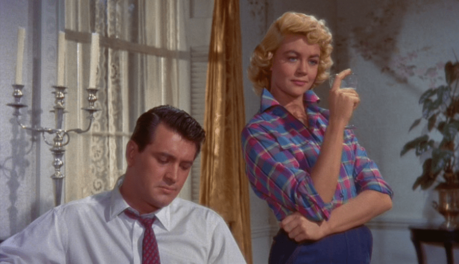 Bacall is fine, but she doesn’t invite our sympathy like Jane Wyman or Juanita Moore. Marylee’s infatuation with Mitch – and the way she punishes everyone around her because Mitch loves someone else – is fine, as good as Malone could muster for a role that doesn’t ask her to do much else besides playact “slinky” for all of her scenes. But she does not attract our loathing like Turner or the half-dozen conventional ladies carping at Cary in All That Heaven Allows. Hudson doesn’t have enough to say; he’s got presence, as usual, but it’s too benign to make him threatening enough to add some real venom to the story. Even though Robert Stack has to try to convince us that he’s losing his mind because there’s a chance that he’s shooting blanks – even though sometimes it takes more than a year for a perfectly normal couple to conceive – he’s playing the most versatile game. At the beginning of the film, he plays a practiced lecher to perfection. He double entendres Lucy again and again. He offers to buy the advertising firm she works at with a single phone call. He sets up a suite for her at the hotel, trying to buy her with handbags, jewelry, a full closet, and an ocean view. (He minces words only slightly when he talks about why he brought her to Miami; a middle schooler of today would be able to guess his game.) But Stack also makes the reformed Kyle a character we can buy, leveling off the presumptuousness and the wild gleam in his eye while keeping the love of a good time intact. It’s a shame that so much of his performance requires him to talk about the good memories he associates with “drinkin’ corn,” like he’s escaped from a choral group which has only practiced “Rocky Top.”