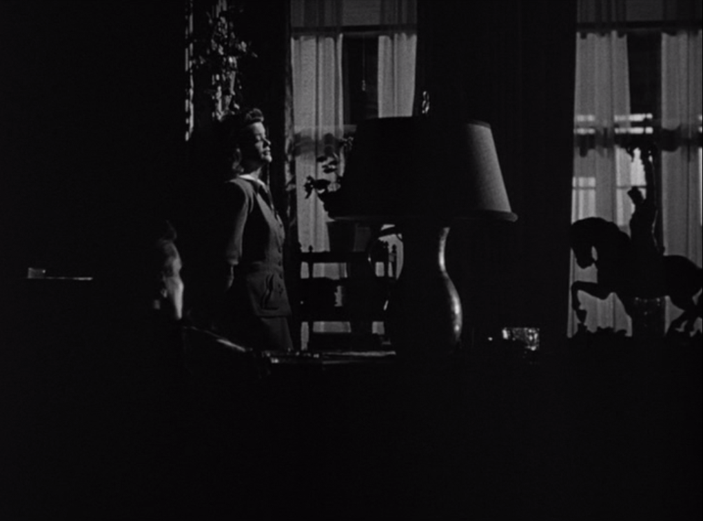 Tourneur and his cinematographer, Nicholas Musuraca, would team up again for the likewise fantastically shadowy Out of the Past. And like Out of the Past, Cat People lets our imagination consider, first and foremost, what might be hiding in those shadows. In that last shot, where Irena makes her love of the growling sounds from the zoo known to Oliver, it is stunningly dark. It’s difficult to know what Oliver is thinking as he sits there in the growing darkness, listening to this pleasantly exotic (Serbian) woman purr about how relaxed she is. Perhaps he is as caught up in her fantasy as she is. And in the first picture, we see a common motif; both characters are lit almost aggressively so that their heads will show up in shadow behind them, like other visitors in the house. As the Reeds’ marriage gets more crowded, so do the profile penumbras seem to grow larger and more intrusive. One almost expects them to chime into the conversations their bodies have.