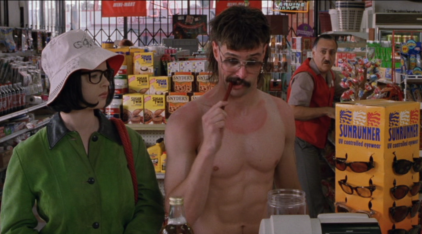 Ghost World is set in a small city which never quite veers into absolute strangeness. The bus route suspiciously, amazingly resumes for the people who sit on the bench, including an old man in a suit who can always be seen there. A girl Enid’s age pops up and talks about her upcoming auditions with as much excitement as Enid and Rebecca can exert in a year. A man with a mullet and an allergy to shirts (but who still has a tremendous tan-line) terrorizes a local convenience store. An art teacher makes her own short film which has been subsidized, quietly, by her parents. A boy with an exhausted countenance works at the convenience store and lets our heroines browbeat him into bumming rides in his old car. Exxon is putting out ads talking about how much they love the environment, which, given the fact that they actually do that now, is a little creepy to watch. Like most cities, the nostalgia diner isn’t so far away from the local sex shop, and both are like lamps for a moth like Enid, who senses the rightness of being in both. Whether or not it’s true, both places are easily read as the kind of places that losers inhabit, and of course those places are Enid’s coziest haunts.