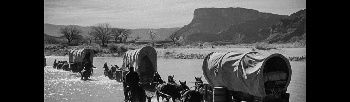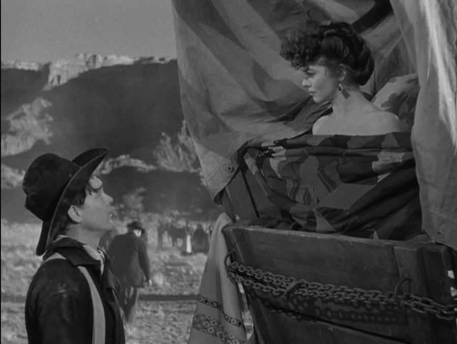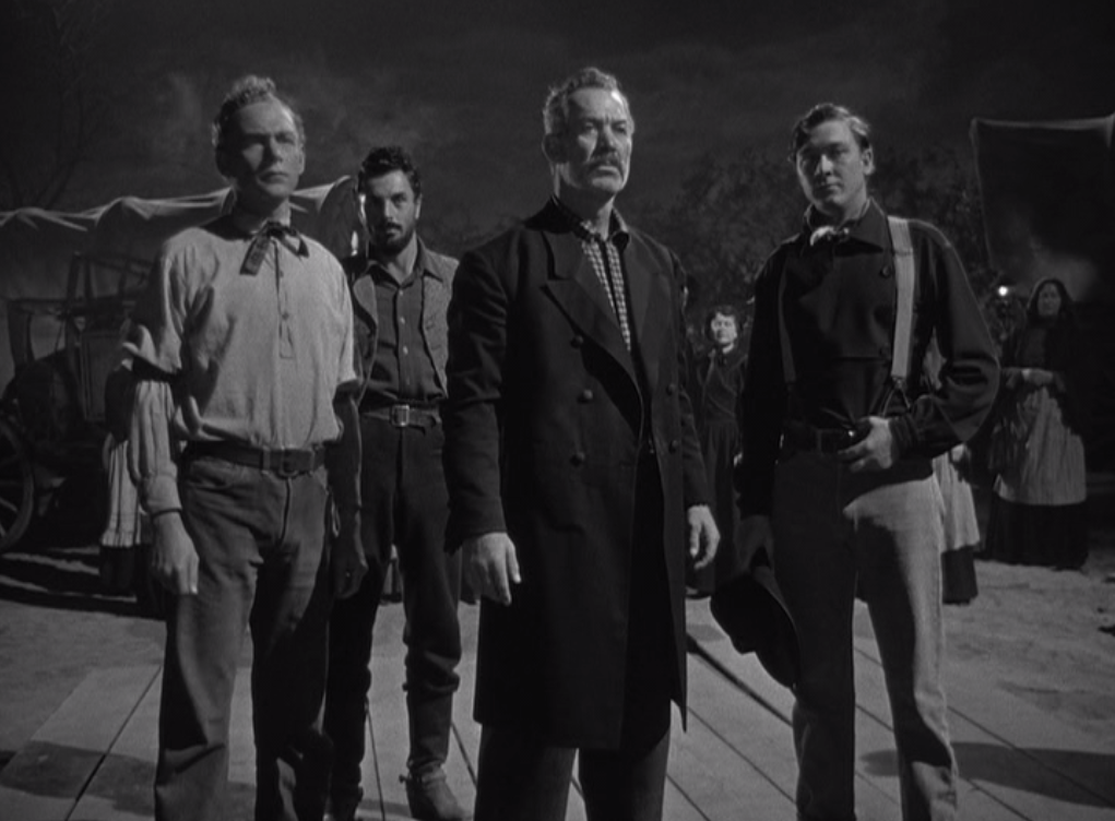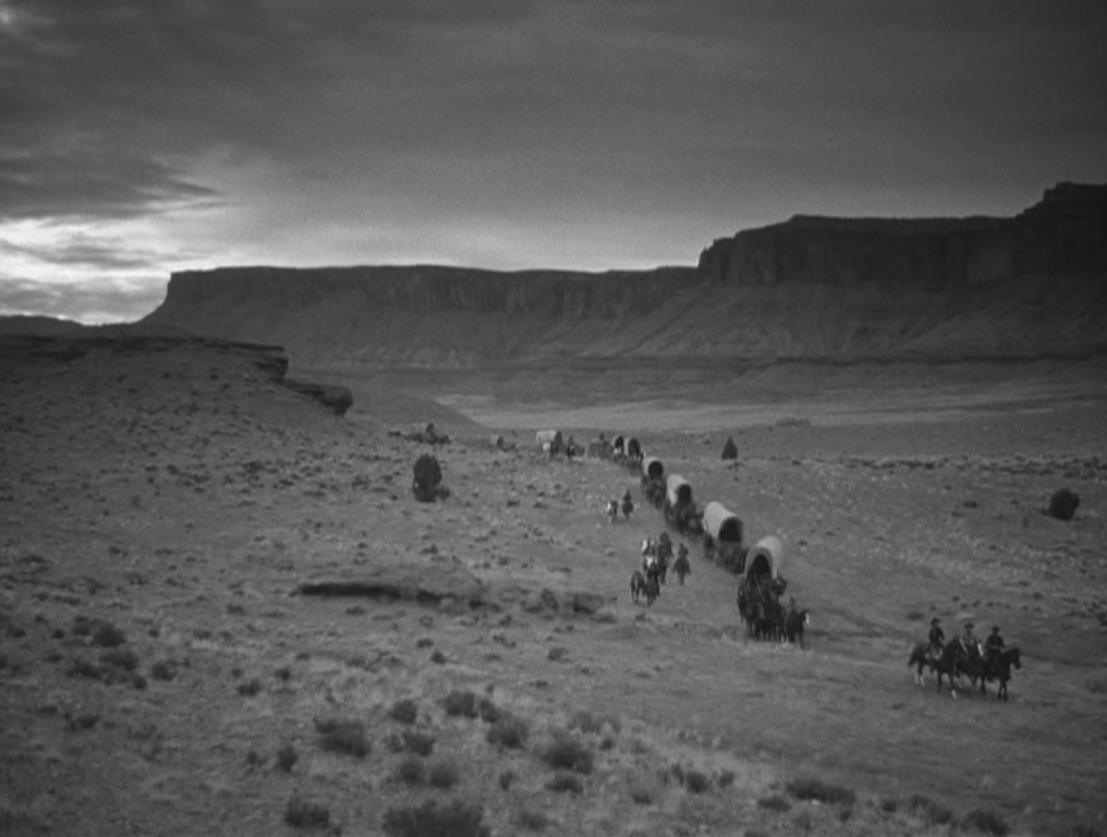 Wagon Master is an unusual western for many reasons, but the cast is certainly top of the list. It has no John Wayne or Jimmy Stewart or Henry Fonda or Gary Cooper to anchor the cast, or alternately to muddy the message with star power. As Travis, Wayne would have brought an experienced man with some braggadocio to the role; Cooper would have brought much the same set of problems, but more handsomely. Its biggest star in the moment, depending on who you ask, is either Joanne Dru or Ward Bond. Dru plays a bit part that could be easily excised from the movie if it weren’t already under ninety minutes, and Bond, despite his starring role, is one of the quintessential supporting actors of the ’40s and ’50s. (I’m pleasantly reminded of Meek’s Cutoff, another Conestoga-heavy western with a marvelous ensemble. Is Michelle Williams or Bruce Greenwood the biggest star? Maybe it’s Will Patton? Paul Dano?) Among Ford movies, the richness of the supporting cast is not unique, but the fact that the starring roles belong to actors whose faces and ages fit the the characters might be. In The Man Who Shot Liberty Valance, watching Wayne and Stewart play men half their age causes an unpleasant cognitive dissonance. On the other hand, watching fresh-faced folks like Johnson and Carey take on a complex job that they’ve never had to undertake before is engaging. John Wayne as a horse trader simply gives off the impression of a man who could be a wagon master if he wanted to. Ben Johnson as a horse trader is someone who is willing to give that job a go for the money, and that’s a fundamentally different impression requiring a visage with fewer lines. Carey is second fiddle to Johnson, which makes him seem even younger. In his first scene, he displays his total lack of ability to multiply; happily, his counterpart seems more than capable of basic math. In many of his other appearances, he’s following around a redheaded Mormon with the sort of faithfulness one typically associates with Journey. Johnson and Carey are two of the great character actors of American film, but they don’t imbue the film with the sort of mythic grandeur that the big A-listers of the time would have necessarily brought to the part.