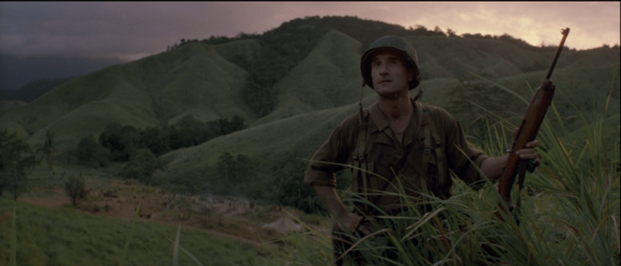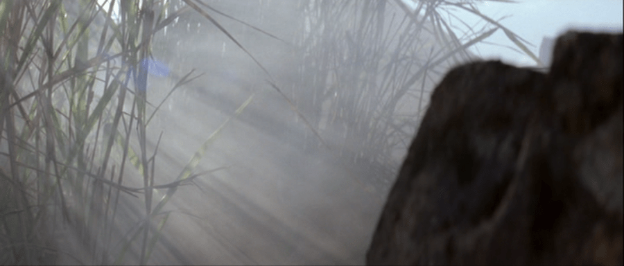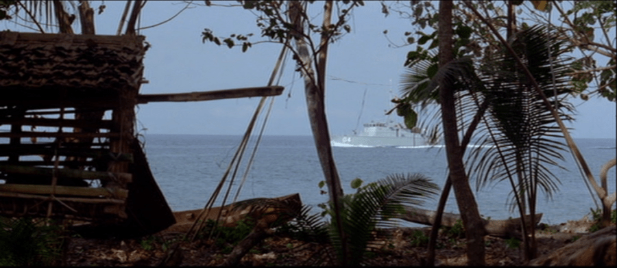 Flying foxes peer at a small group of GIs in the jungle. The mountains loom and blood runs into a small stream in the valley; presumably, the tides have run the blood of the amphibious invasion off into the open ocean, for the water on the beach is perfect aquamarine. The grass hides men climbing uphill but does not protect them from bullets or explosives. A small bird, bloodied and crippled, squeaks helplessly. This war takes place somewhere. Most war films try to give a sense of place; even a movie like Wonder Woman, which is no one’s first thought when you mention “war movie,” made a point of showing us a little village. The Thin Red Line is less concerned with people and individuals than most other movies, period, but it is intently focused on nature. In the Gettysburg Address, Abraham Lincoln makes a point of noting the ground itself, claiming that the men who fought and died there hallowed it. Malick does not try to give us the impression of hallowed ground – Witt makes a point that war does not “ennoble” men, that it rather “poisons the soul” – but he wants us to know that there is ground that existed far before the Japanese entrenched there, before the Japanese and Americans viewed each other as expansionist rivals in the Pacific, before Matthew Perry sailed into an insular nation to “open” it, before shogunates and samurais, before Lewis and Clark and Daniel Boone, before nations and flags and combat. The Thin Red Line has no setting, for setting implies that the place serves the story.