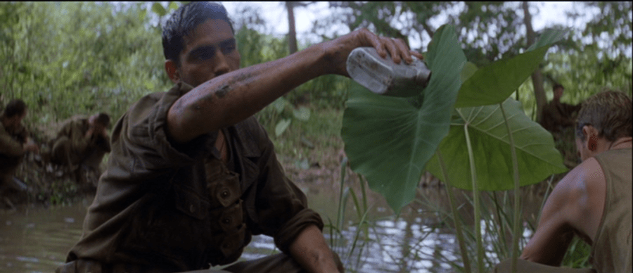 In his essay on The Thin Red Line for the Criterion Collection, David Sterritt calls it “arguably the greatest war film ever made.” I’m not sure I would go that far, seeing as Grand Illusion still exists, but I have a hard time thinking of a better war movie in which a battle is the centerpiece of the plot. It achieves something which I wasn’t sure was possible: it gives us scenes of battle which are engrossing and bloody and explosive and terrible without once making it exciting. Say what you will about D-Day in Saving Private Ryan and its powerful verisimilitude, or the vast scale of Gettysburg, or the tension of The Hurt Locker, but each of those movies is exciting, each in its own way like a video game. The Thin Red Line is not like a video game. It emphasize the unseen, the out and out terror of making a frontal assault when you have no idea what’s ahead of you. Whyte (Jared Leto) orders two men to go forward to scout out a position ahead, and the two men look at each other. They know it’s curtains. We know it’s curtains. A few moments later, it’s curtains. Much of this fight is just suicide by other means, and what’s even more stunning is the timing of this part of the Battle of Guadalcanal: the marines have already cleared the beaches and fought the Japanese force into the mountains. The campaign has been ongoing since August of 1942; the events of the film probably take place in December of that year or January 1943. In some ways Malick (and author James Jones, whose novel of the same name this movie is based on) have chosen some of the most mild action of the battle to highlight. A danger every bit as great to the American soldiers as machine guns is dehydration which of course is a great risk, but it’s far from the most pressing fear I imagine most GIs had during the Pacific theater. None of those other concerns make the scenes of battle any less disconcerting.
