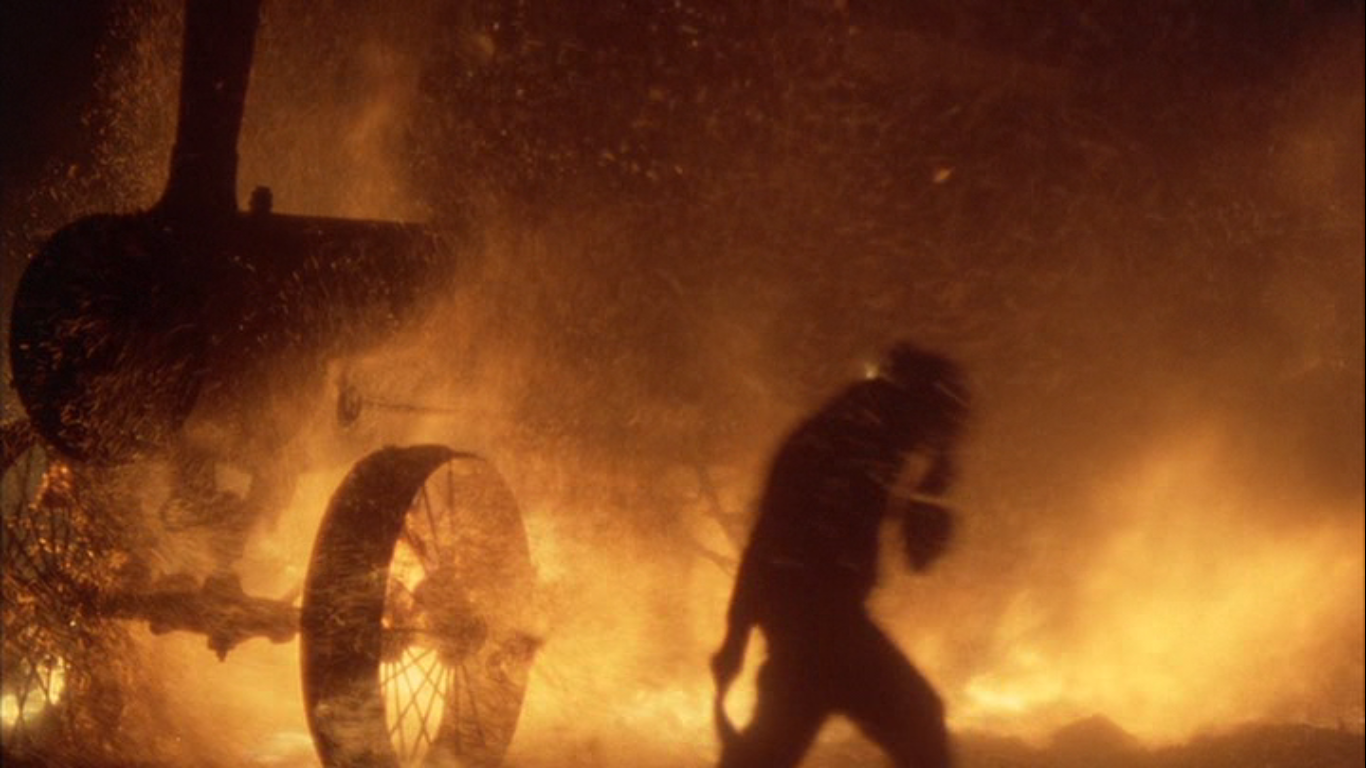 The murder of the farmer is the end of the movie, even if the film runs on its own fumes for another twenty minutes or so. In truth, the film reaches its climactic moments too soon, well before all of the picture is giftwrapped. A plague of locusts descends on the farm; in the mad, losing battle to pour locust after locust onto bonfires, the farmer swings his lantern at Bill and ignites everything. “Crazy!” Bill shouts at him, but nothing about Hell is ever depicted as crazy in the Bible. For the farmer, all has been illuminated; his darkness is burnt away by the fire, and being fooled when he should have known better for more than a year is at least as self-destructive as igniting an already spoiled harvest. It’s a scene which almost has too much action for the rest of the movie to cope with – so much of Days of Heaven, despite the frequent scenes of farm work, could easily be read as laconic – but it’s probably the ten minutes or so which exemplify the film. Allusion and symbolism are laid on top of stunning visuals, and what emotion there is to be read in the people is there in the land and the fire and the great house as much as it is in their words and bodies.