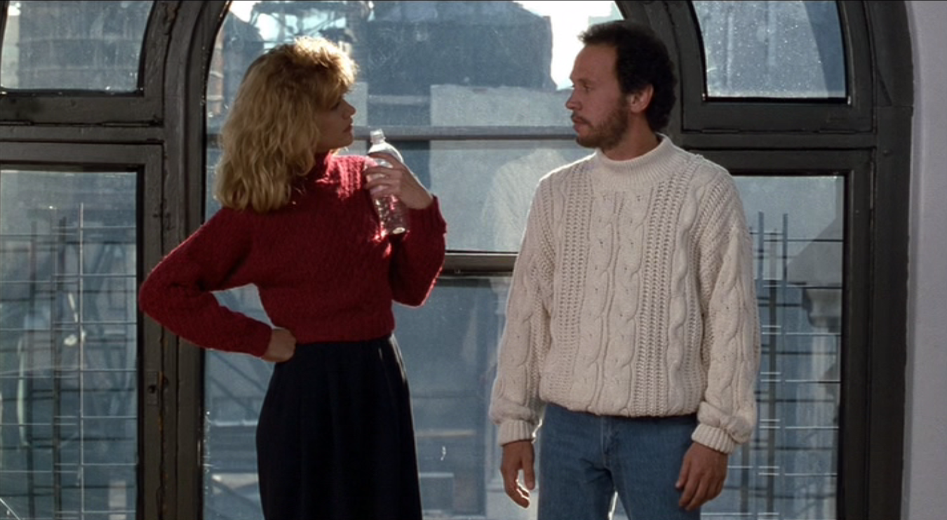 But the movie doesn’t go there, and instead we’re treated to all sorts of charming little moments with Harry and Sally that are the stuff of a budding friendship. Sally effortlessly punctures Harry’s pretensions about death; Harry calls attention to Sally’s hatefully specific restaurant order. (Real talk: if I had been Harry in that situation, having known that woman for a few hours, and she had ordered like that in a diner in front of me, I would have seriously considered hitching the rest of the way to New York.) The two of them figure out they like each other, which is no small thing to figure out in a movie. It’s one of the few movies about adults which think about a mature friendship happening without something like “World War II” or “my dead, dead child” bringing people together; more than that, it’s a rarity among romantic movies that it is interested in friendship as much as it is in sex. The vast majority of romantic pictures, either because it is tradition or because it saves time, make like James Fleet in Four Weddings and a Funeral and merely mutter “The thunderbolt!” while marveling at how much their primaries love one another. The best moments of When Harry Met Sally… are by and large gentle and funny. We can watch Harry and Sally in bed (watching Casablanca, of all things) from their separate apartments and not feel voyeuristic in the least. Relationships are meant to be exclusive; friendships are easier to be part of if you’re a third party.