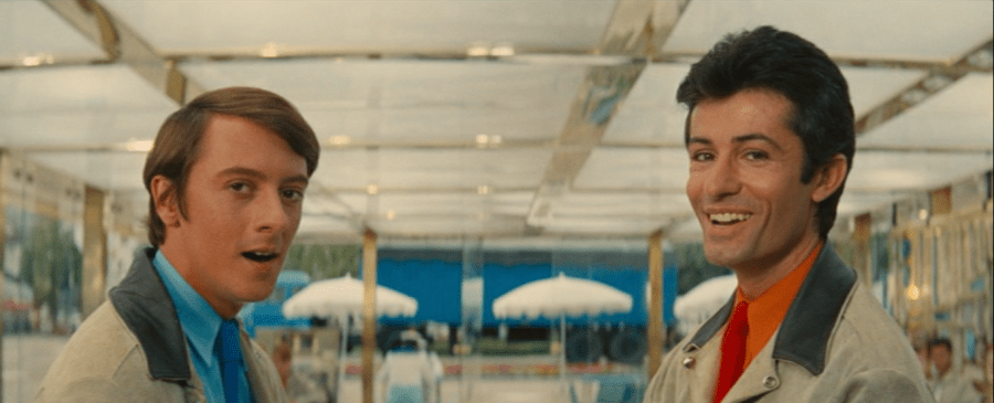 My personal favorite, and one that stands out from virtually every other song in the film, is “Maxence’s Song.” Jacques Perrin, whose hair is as unfathomably blonde as Gene Kelly’s polo is pink, acts Maxence very differently from everyone else, and Demy shoots him differently to boot. “Chanson des jumelles” is not shy about giving Deneuve and Dorleac ample opportunities to look directly into the camera (and neither are other songs featuring the Garnier twins). “Nous voyageons de ville en ville” lacks quite as many of those chances given its acrobatics, but there are some moments where Chakiris and Dale make direct eye contact with the camera, and several others where they look in the direction of the camera because they are ostensibly looking at Yvonne behind the counter. Kelly finds it himself every now and then. But Perrin never does. The camera pans gently right-to-left, following him from center and then exposing more of his face. Perrin, for his part, moves his gaze all around the screen, never quite finding someone to focus on. Even when he’s looking at the camera, he’s not looking into it. His eyes are not quite centered on the camera’s eye, and just when we think he might, there’s a cut and we now get the entire cafe.