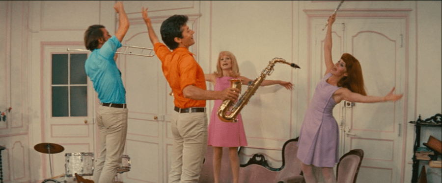 When you see “Jean Barthet: Chapeaux” in the opening credits, you know that it’s going to be good if they had to put him up top. Nor do his hats disappoint! They are enormous things, like mutant butterflies in marvelous yellow and pink – in fact, Danielle Darrieux wears a hat with a butterfly on it towards the end of the movie – threatening to swallow up Deneuve’s or Dorleac’s heads like nectar. The hats are symbolic of the delightful excess of The Young Girls of Rochefort (which I’m not referring to by its French title because I don’t want to sound super pretentious, but heaven knows that “demoiselles” is so much better than “young girls”). It’s a movie that dances first and sings later, even if the songs themselves are occasionally a little goofy. “Chanson des jumelles” is probably the best-known number, and judging someone by how s/he reacts to it is my new favorite personality test. “We are twin sisters,” they chirp happily, underneath their huge hats, “born under the sign of Gemini!” Any relevance to their zodiac sign short of the doubling down on twinness is lost on me – are Geminis likely to favor headgear the size and shape of a large pizza? – but they seem happy about it. Subsequent verses address topics as diverse as hereditary birthmarks, selling French fries, and how much they like puns. It’s weird under the best of circumstances; when the two of them refer to it as “our song” later on in the movie, and Delphine namedrops Michel Legrand, the movie takes on a whole new type of self-referential strangeness for a few seconds. It’s nothing short of delightful. George Chakiris (in orangest orange!) and Grover Dale (in bluest blue!) look on from their deep chairs and smile broadly as the Dorleace and Deneuve launch themselves into “their song” with the zest of, respectively, a thousand lemons and grapefruits. Leave your irony behind as you watch The Young Girls of Rochefort; it is a musical which is just raucously lavish with its own excitement. Five years later, the MC in Cabaret told audiences with enough sarcasm to boil enough spaetzle for your whole family: “In here, life is beautiful – the girls are beautiful – even the orchestra is beautiful.” There’s no sarcasm in Young Girls, only pleasure.