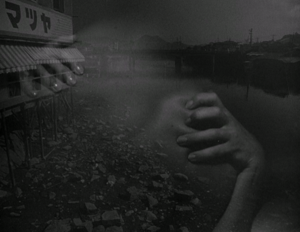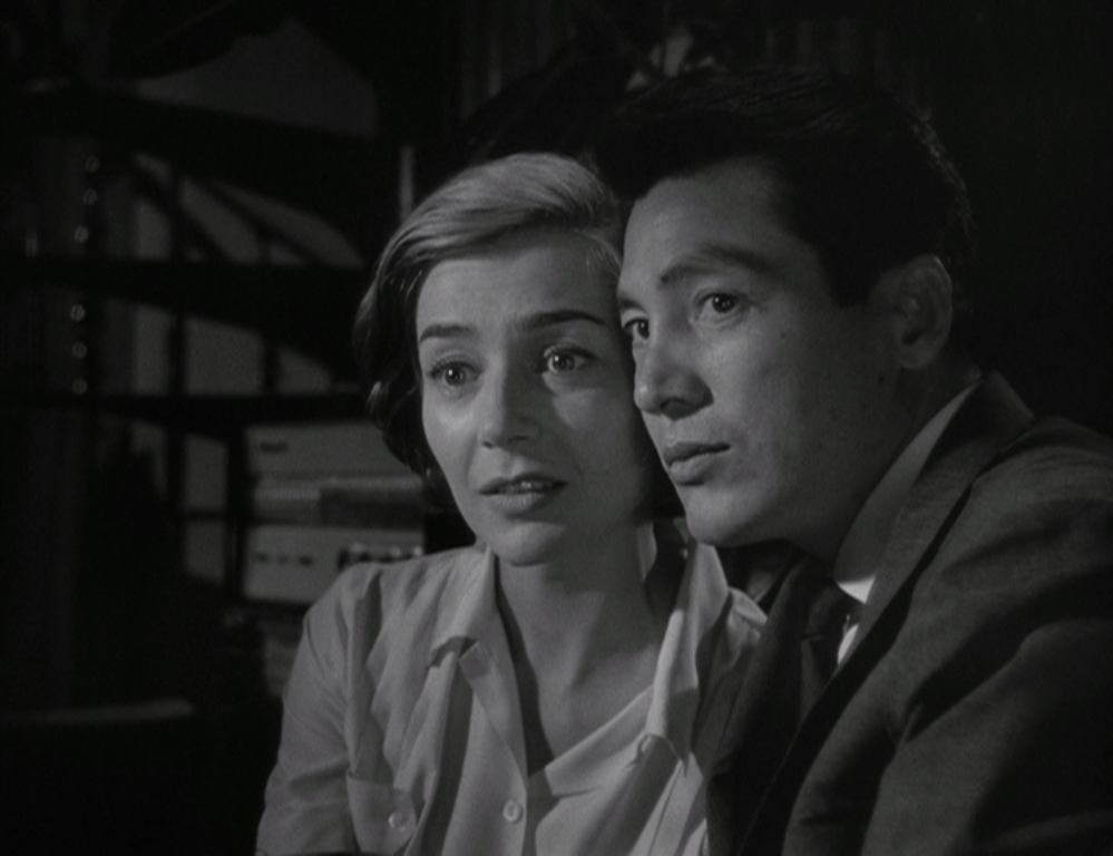 In a sea of other people, a French actress (Riva) and a Japanese architect (Okada) fall painfully and deeply in love. That sea of other people is less the present population of Hiroshima and more the ghosts of World War II. She had been in love with one of the German soldiers (Fresson), who was killed near the end of the war, and she paid the price that other French women with German lovers were forced to pay. He was in the army, away from the city when the atomic bomb struck. Much of the early space in the movie is taken up by archive footage, documentary recreations, voiceovers in which she claims to remember Hiroshima and he tells her that she does not, and the terrible statistics of the day the bomb was dropped. So it is that him and her—nameless, as they are in Last Year at Marienbad, too—look at each other and see other people. So it is that they are surrounded by masses of people who signify death and decay. The cancer which will obliterate Hiroshimans and their heads of hair is like the snipping scissors at her head during that public ceremony of humiliation which she was barely present for. There is never a sense of rebirth in Hiroshima mon amour, but merely that something new has happened, that there might be some literal change in the air. Her hair has grown back, say, or she’s escaped the town of Nevers on the Loire, or there are buildings intact in Hiroshima. But no one seems terribly invested in the now; it’s the then that counts.