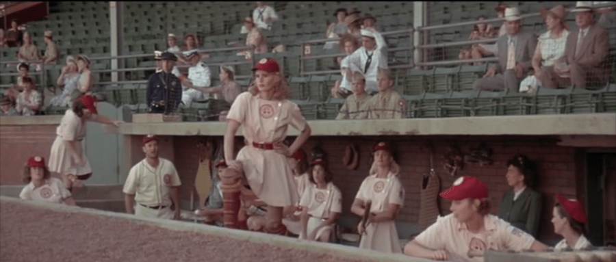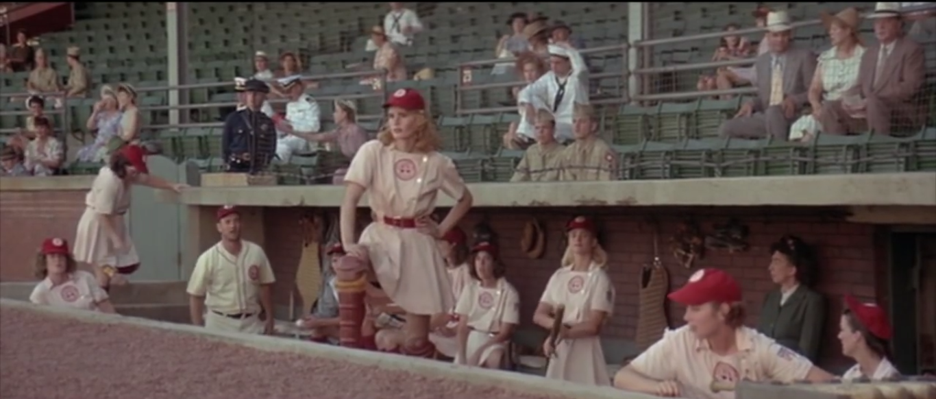 One of the things I love about A League of Their Own is how it is a study of women in action. I think it’s one of the reasons why the movie struck a chord with viewers when it first debuted and why it continues to be enormously influential into the present day. The summary of women on the home front during World War II inevitably is boiled down to “joined workforce, continued to raise children, were very worried for their men.” A League of Their Own does all of those things, some more effectively than others; Evelyn trying to manage her son is a more effective topic in this movie than the death of Betty’s husband, for example. What troubles me about that summary is not that it’s necessarily incorrect so much as it’s just short, as if it explains everything and there’s nothing left to say. It strips the work and the sweat away from what women did during the 1940s and turns it into an almost formulaic precis for why the women’s rights kicked off. A League of Their Own treasures the sweat of bus trips and etiquette lessons and ninth innings all alike, and it is fundamentally about the kinetic actions of work. The AFI 10 Top 10 named Raging Bull its greatest sports movie, which is sort of like saying 2001 is the best movie ever made about deep space exploration or that The Rules of the Game is the best movie ever made about a house party. A League of Their Own (which, incredibly, was left off of that list) is a sports movie in the sense that its most important moments take place on the field. Kit piledrives Dottie at home: of course it has to do with the relationship between the two of them, but it’s also a baseball moment. The baseball is literally the focus of the shot when it rolls out of Dottie’s hand. At any rate, there’s nothing about A League of Their Own that forces you to imagine what must have been going on with the women of the homefront. You don’t have to imagine a legion of Rosie the Riveter types marching into the factory because the All-American Girls Professional Baseball League exists and is returned to as the setting again and again.