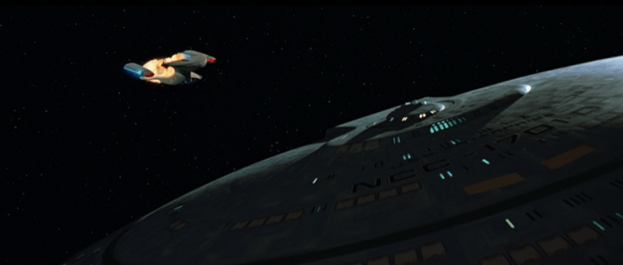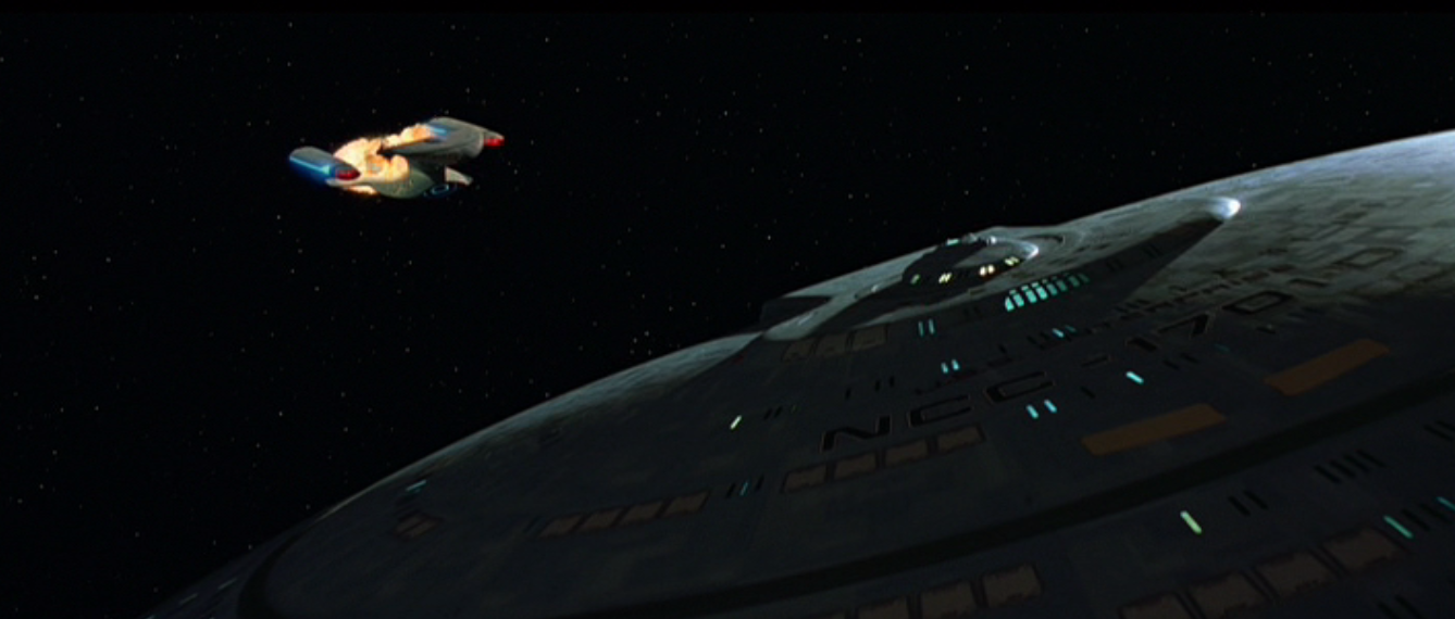By focusing on time as a major thematic element, death seems less important by the end of the text. The deaths of Robert and René, limited as they are to the beginning of the picture, stand out as especially raw wounds. But the first death of Kirk, eclipsed by the second and rather more permanent death of Kirk, is surprisingly not-sad. It’s melancholy to watch Picard stare at the little pile of stones he’s made on Veridian III to commemorate the death of a great man (though the effect is ruined by the circular track on Picard as he stands on this spot atop his mountain – is he mourning James T. Kirk or Rod Stewart?), but Kirk has already died once. Watching him die again is maybe a tad more final, but Kirk has already made his choice. Like Achilles, he has chosen a glorious ending—saving hundreds of millions of people from the whims of a madman—in lieu of dying in his bed one night. The saddest death, if it can really be called a death, is the Enterprise-D. (Generations is so contemplative that I think it’s easy to misread it as undramatic, but we’re talking about a movie that kills the face of the franchise and its second-most recognizable ship.) Watching people pull everything they can out of the wreckage, from computers to a very frightened Spot, is especially sad. Generations takes away finality, for as long as the Nexus exists and can be charted and manipulated, nothing can really be said to last forever. But at the same time it’s hard to imagine a sequence of events which will spare the Enterprise, which will make its own grave not far from James T. Kirk’s. “What we leave behind is not as important as how we’ve lived,” Picard tells Riker. As the two of them beam up to another ship, never to see the corpse of the Enterprise-D nor the sparkling eyes of Jim Kirk again, it’s the only comfort either man can take along with him.