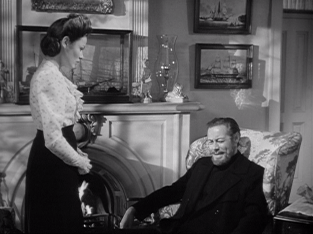 George Sanders is, even in the best of times, no fitting successor to Rex Harrison. Nor is the plot featuring a mere adulterer with an absent family nearly as interesting as the foul-mouthed ghost of an old sea dog. Miles Fairley is a children’s book author with the practically euphemistic pseudonym “Uncle Neddy” who runs into the handsome Lucy Muir at the publisher’s. He is instantly smitten. Daniel, by the fact of his incorporeal state, is reduced to wooing his living love through doing deeds and reciting poetry. (Lucy’s heart is softened as regards Daniel when he drops a few lines of Keats on her.) Miles does not have to use words; he insinuates himself physically, creeps up close to her in a shared carriage during a storm, paints a portrait of her in her bathing suit, kisses her frequently. It is, by the standards of Edwardian England, a torrid affair; for ’40s film, the liberties he takes with her are no small ones. Alas that Miles’ presence means Daniel’s absence, and that without Daniel the movie fades into tropes. It turns out that Miles is a serial libertine, and everyone could have guessed at it but Lucy. Lucy grows old; Anna gets engaged to a man with several names; the relationship between Lucy and her (gasp) thoroughly protective and devoted maid, Martha (Best) gets some play. How dreary the last act of the movie is! There’s no surprise, no energy, no zest. Even Mankiewicz seems tired of the film by then; the adroit stair-climbing camera is replaced by one which sees static wide shots of rooms and little else. Bernard Herrmann’s score becomes frivolous and screechy, as if it must do some mouth-to-mouth resuscitation on the movie. What a relief it is when Lucy dies an old woman and Daniel can come rescue her from her solitude and our boredom, and I’m sure the protagonists were glad of it too.