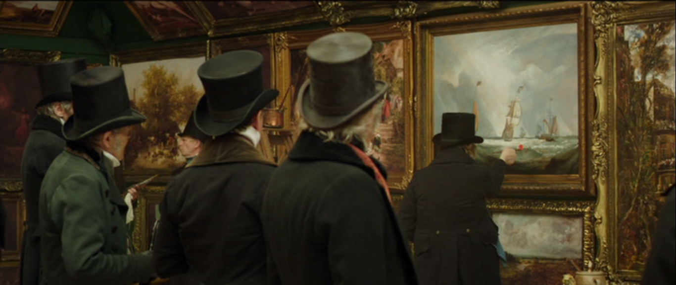 It takes a great will to make a biopic which does not lead to something. Say that Topsy-Turvy is a biopic, which I don’t know that I agree with but wouldn’t argue long about, and it is a clear case of leading up to a moment. Specifically, the movie ends not long after the premiere of The Mikado. Mr. Turner has no Mikado. No one drops by to emphasize the names of his most famous paintings, or, indeed, to give them names at all. Like a Greek epic, we begin in medias res, when Turner is already one of England’s most important painters. The movie does not answer the question of how he got there. There is no “With great power comes great responsibility” moment, and if one’s preference in a biopic is some culminating moment or forceful event, then Mr. Turner is not your daub of paint. The same goes if one wants one’s narrative film to be one’s excuse for historical knowledge or to be some signpost of accuracy. The movie is slow-moving, as apt to make a scene of buying a pig’s head for luncheon as it is to turn an art exhibition into the backdrop for a feud. One comes to know people from their quotidian activities and not from their outlier moments. Regardless of one’s opinions on Turner’s oeuvre, it seems fair to say that the character is someone we get the measure of based on what he did last Tuesday and not because he put oils on canvas.