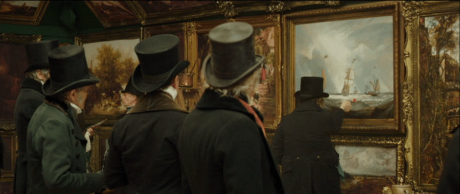 The list of things which annoy Turner fills the rest of the movie, so I won’t go into it here. Suffice it to say that one of those annoyances gives the movie its keenest moment, in which Turner runs into John Constable (James Fleet) putting the finishing touches on The Opening of Waterloo Bridge Seen from Whitehall Stairs, a painting which is thoroughly red. Turner is not enamored of Constable. In front of the rest of the Royal Academy, he goes to his own painting on display: Helvoetsluys, a fairly modest seascape. He takes his brush and lays down a single red mark on a painting which is ten types of blue. The Academy is appalled. They’ve just watched a man obliterate his own work; a voice, however, says not to count out Turner’s ingenuity. He returns, wipes off a little excess red, et voilà, a buoy. It is stunning one-upmanship filled with the best qualities of that sort of thing, a little red splotch which is nerve, gall, and brilliance all in one. There’s a smattering of applause as he walks away. I wanted to as well.