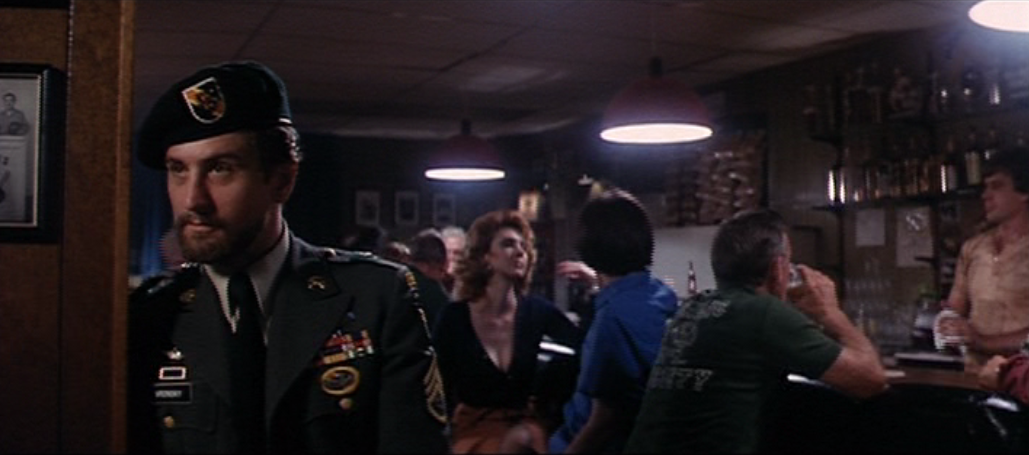 If there is a greatness in this movie—which, for all of its obvious flaws, is still an essentially canonical opinion of The Deer Hunter—it remains stateside, in a little industrial town which might accurately be called a dead end if so many people weren’t dying in Vietnam already. This movie needs the Russian Orthodox wedding and the rowdy reception more than it needs its Russian roulette or its fall of Saigon. Without them, the film would lose the strength of Michael’s return home and the way he dodges a party, or how he connects with Linda in Nick’s absence, or how he refuses to shoot down a deer he’s hunting. Most of all it would fail to anchor the movie’s ambiguous-but-not-really ending, where a few survivors sit around a formerly raucous bar and sing “God Bless America” together. One of the most frequently reported reactions to this movie is a sort of stunned silence which can last some time, and it’s the one I remember having the first time I saw the movie. It leaves you with a great stillness, amplified by Vilmos Zsigmond’s photography and Stanley Myers’ “Cavatina,” and it lingers on for a while, keeping the viewer somnambulistic as s/he wanders on to the next task of the day. War movies are frequently mental exercises, calling upon our reason to deny the justice or efficacy of combat. The Deer Hunter is something else altogether, less interested in the injustice of the war than the feeling of emptiness that it bestows.