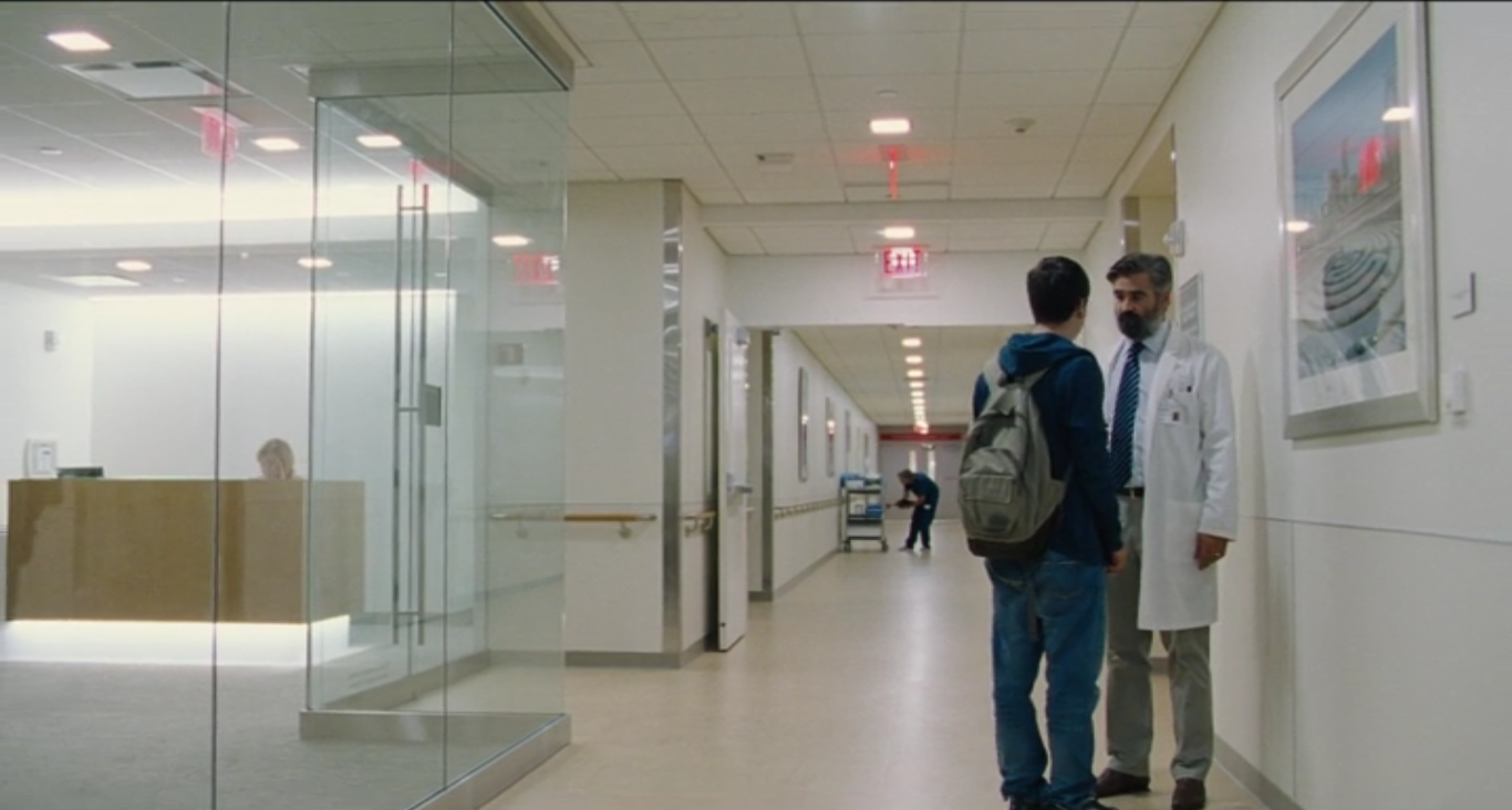 The Killing of a Sacred Deer is a highly individual film, which I came to realize when I was trying to diagnose it about halfway through. The acting is distant and completely devoid of melodrama. Sometimes voices are even missing tone; Colin Farrell has become especially good at speaking in a clipped, matter-of-fact way, while Barry Keoghan displays a talent for a sing-song bounce without melody. Did that make it like Bresson, whose actors were more like “models,” in his words? Bresson could never have made this movie, though; just because Christian Patey and Martin LaSalle didn’t speak with much emotion either doesn’t mean that Sacred Deer has a worldview anything like those in L’argent or Pickpocket. Lanthimos hates a straight close-up in this movie, choosing some other shot more often than not. He is perpetually distancing us from the characters in wide shots or, alternately, taking us just above or below a character’s face. We look up at Martin (Keoghan) as he explains the choice that Steven (Farrell) must make, his head essentially hovering over the table. While he eats what is almost certainly Mom’s spaghetti in front of Anna (Kidman), the camera does not center on him, choosing instead, with a little help from Keoghan’s leaning, to put him in a position to the right. (This is historically a more positive position to place a character than not.) I was reminded of Paul Thomas Anderson, or Malick, maybe, both of whom have strong command over a wide camera. Yet neither of those directors is above an extreme close-up when a character is making a point or must be reckoned with, and so I bounced off of those comparison as well. Lanthimos is not as brutal as Haneke, but he is more complicated than Fincher. He likes his long moving shots, but McQueen likes them more. Heck, I even started trying to relate the movie back to novelists; the closest comparison I could make was Camus, but that doesn’t seem to fit neatly enough either. The best way I can understand the movie, then, is on Lanthimos’ own terms, and his terms are as individual as the movie itself. I return to the way the movie opens, the way that Lanthimos seems to predict some objections to his ectothermic picture. Sacred Deer begins with the movie’s only extreme close-up, panning slowly back to reveal heart surgery, but not until we have gotten our fill of the inside of a heart, thumping and squelching along. How can we say this movie has no warm, beating heart? Rather than give an ounce of his movie over to melodrama, we begin with a purely physical heartbeat.