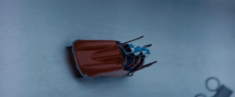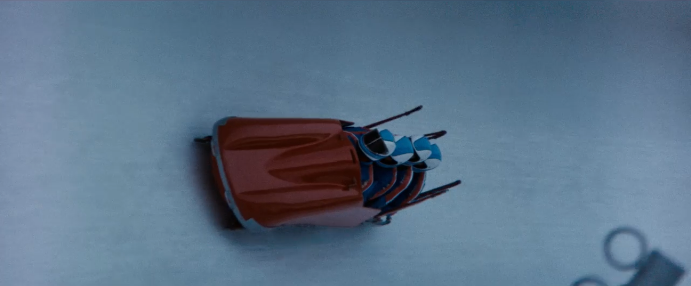 Maylam juxtaposes the speed of his shots intelligently. When given an opportunity, he’s glad enough to sit and watch a performance, as he does from above with the Soviet pairs’ skaters. Yet he also recognizes how powerful slow-motion is in a picture like this one. In one shot, we see Rodnina and Zaitsev slowly twirl with her head just inches above the ice, but at other times we see the speed that they reach flying around the ice. The beginnings of the bobsled competition are noted: the thrust of hips, the checking of goggles, the pulling of gloves, and the sprinting of the push start. And after all of those close-ups in a real time, Maylam pulls back and gives us a chance to see what a bobsled looks like as it smoothly, almost effortlessly, rumbles down the track. We’ve already watched the faces of men, including Coburn’s, going down this track three times. We understand the speed and the preparation now, and we’re prepared for the beauty of the shining paint job glowing against its white background, knowing that if we were to stand where the camera was in real time we should hardly be able to get more than a blur.