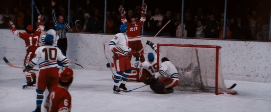 Hockey seems slow in the movie, although that may have as much to do with the difference between the “amateurs” of 1976 and the all-star teams we’re used to seeing now, as the sport has evolved and the athletes have gotten bigger, stronger, and faster. There are more men who have fallen to the ice, who jostle for the puck with their sticks, who crowd around one another. Hockey is given as a game of speed, certainly, but it’s also very much a game of scrums in the way Maylam depicts it. And when he does call for slow-motion for hockey, it’s almost because we need the slow-motion to see what’s going on: namely, a goal is scored.