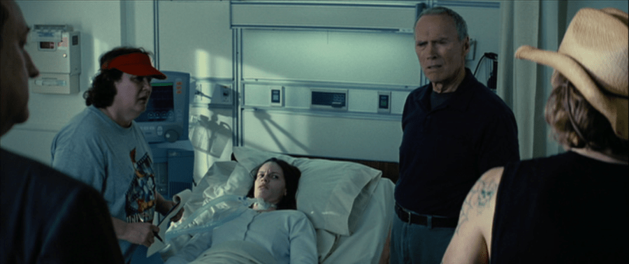 The center of the movie is, despite its weird adventures into “Don’t give me nice things because I love my welfare too much” and “Have you noticed that all the people of color in this movie do something bad to a white person except for Morgan Freeman?” territory, is the relationship between Maggie and Frankie. The intention is clearly to give a fatherless young woman a strong male figure to become loyal to, as the old man whose relationship with his daughter is kaput gains a new one. How much one believes in this relationship is contingent on how much one believes in Swank and Eastwood as actors. Swank is fine, although the movie gives her little more to work with than a hick accent and a perky attitude. Eastwood is fine, although he’s playing “gruff and soulful” and not an actual human being. Even if Swank and Eastwood were levels of magnitude better, there’s no reason to think that their characters would come to life.