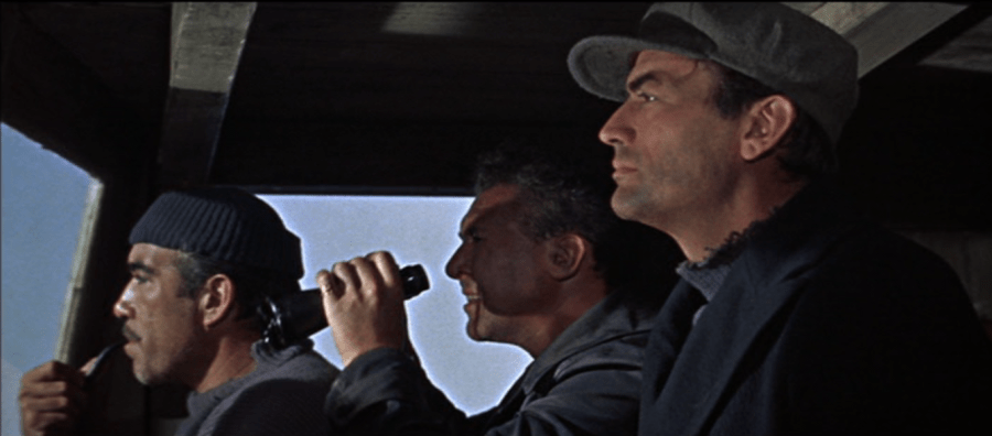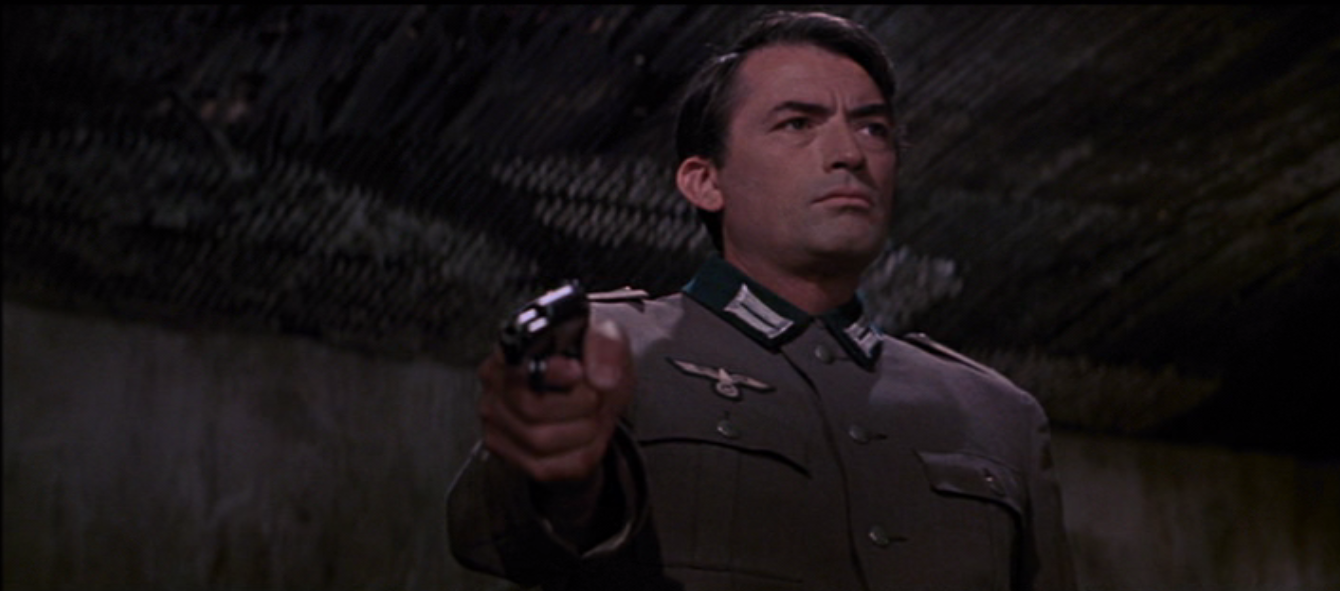 Miller spouts off rather a great deal in this little segment of the movie, which is just as well; they had David Niven hanging around and hadn’t used him all that much, comparatively speaking, before this scene. He exists to pick up a thread laid down early in the movie by Jensen (James Robertson Justice), who laments to an aide, Cohn (Bryan Forbes), that for all of the effort that goes into problem-solving in wartime, that attitude never carries over to peace. Characters come in twos, more or less, in this film; Mallory (Peck) with Stavrou (Quinn), Spyro (James Darren) with Maria (Irene Papas), and Miller with Franklin (Anthony Quayle). That last is probably the only one of the bunch which is not fraught with some terrible difficult from the word go. Miller and Franklin have simply known each other for some time, and Miller in particular seems bound to look out for his superior officer. When Franklin breaks his leg trying to get up the south cliff of the island, it begins to look like the strike team may be forced to shoot him for its own sake. (Franklin, who crawls off with his pistol while he thinks no one’s looking, certainly seems to think so.) When Mallory indicates that he wants to speak to Franklin alone, the camera almost immediately cuts back to Miller at the far left, who puts his hand on his sidearm and who clearly means to use it on a fellow Allied soldier should he use his own on Franklin. It turns out that Mallory has used that alone time to tell Franklin that the mission has changed: they are to be a distraction, not the starring act, and when that comes to light after Franklin has been captured, Miller is once more wroth with Mallory. “I just hope before this job’s over that I get a chance to use you the way you’ve used him,” he spits.