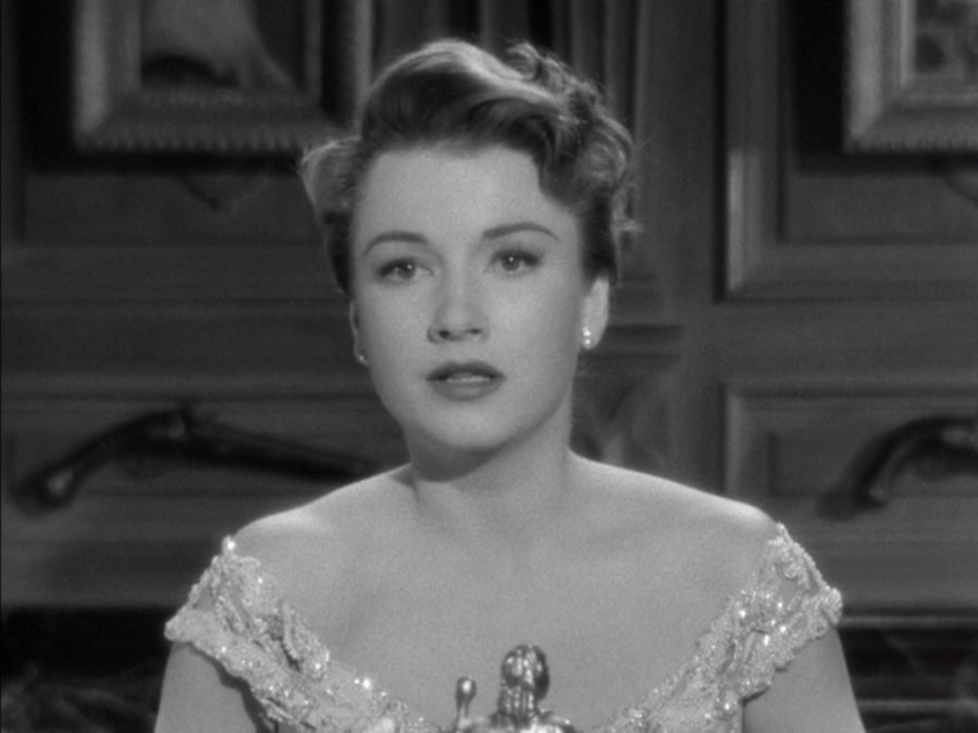 The plot of the movie relies on the subtlety and brilliance of Eve Harrington (Baxter), who wants security on her terms. Her plan is a little amazing, to say the least: weasel her way into the life of a great stage actress, make herself essential to the actress and, by the transitive property, her friends, and then insinuate herself as a stage actress. And yet it works because her marks are easily won over by a good story. Eve spins a yarn of wartime widowhood and of obsession with Margo Channing; the Richards fall for the first half, while Margo falls for second. It’s our first proof that Margo does not understand people, although if we were so inclined we might note her early comments about the inhumanity of autograph seekers. Her man, Bill (Gary Merrill), does not understand people. Her pet playwright, Lloyd (Hugh Marlowe), does not understand people. Lloyd’s wife and Margo’s best friend, Karen (Holm), seems capable of understanding what makes someone tick but is personally gullible. It is eminently tempting to suggest that their ignorance stems from the fact that, as theater people, they have lost the ability to tell the difference between what is real and what is fabricated, but neither Eve nor the critic, Addison DeWitt (George Sanders) have that problem. (Nor does Thelma Ritter’s Birdie, but she doesn’t really count because Thelma Ritter was actually the world’s first psychoanalyst.) What makes someone truly clueless about others in this movie is their distance from the in-crowd. Thus Karen’s ability to read others, which comes and goes; as neither actor nor director nor writer nor producer, she manages to keep herself more or less knowledgeable about other people while being surprisingly credulous about Eve for most of the movie. (This also helps us to root for Karen insofar as we can root for anyone in the movie; she can feel regret for insisting that Eve meet Margo in the first place, and we feel for her.)