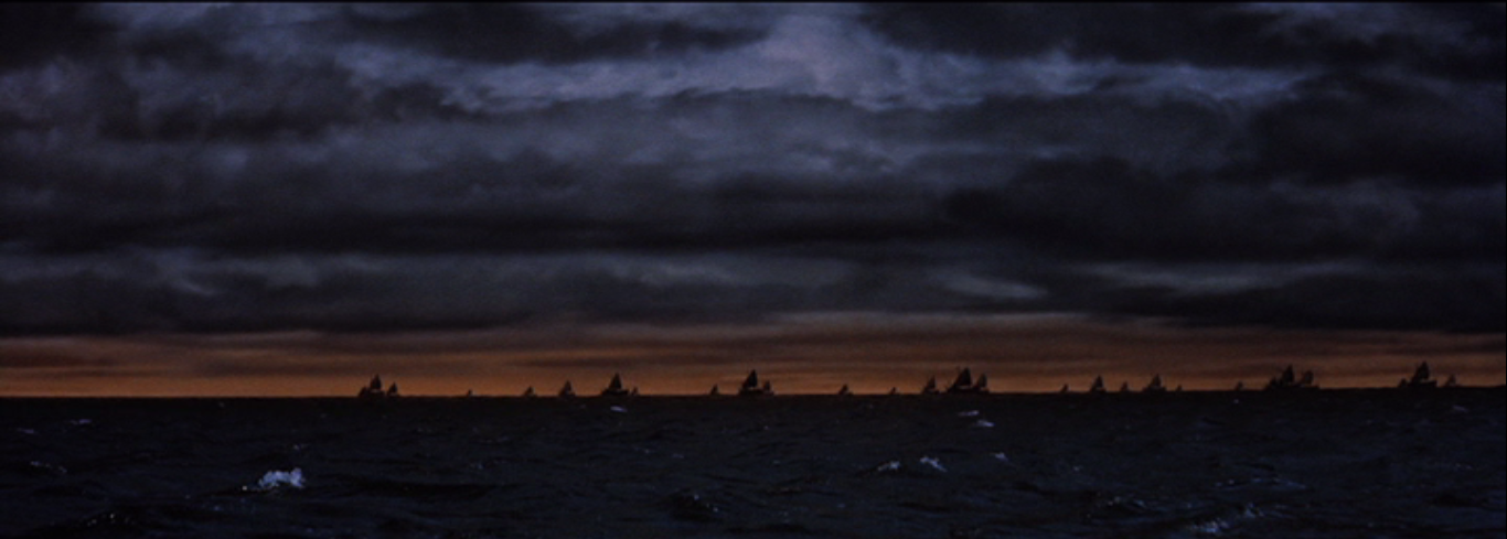 William Wyler does most of his best work in this movie when people aren’t talking. The dialogue is either forgettable or repetitive, even in the hands of some of the movie’s better performers. Stephen Boyd as Messala is, as we’ll see, probably the most essential single element outside of the title character, and yet his dialogue rapidly falters into “Boy, Rome is great, don’t you think so!” territory and never recovers. Even closeups are practical as opposed to meaningful or emotional. For Wyler, the meat of the movie is in landscapes or in the perspective that great distance allows. The hand-to-hand combat of the naval battle between the Romans and the pirates is confused, but there is tension and excitement when the camera pulls back and gives us a sense of the scale of the fight. The battle is set at twilight, with what appears to be a genuine tempest forming above the thin line of orange on the horizon. The models are obviously models, but they are beautifully made so as to match the picturesque (and yes, equally constructed) setting. Compared to the obvious models of more contemporary naval vessels in other movies of the ’50s and ’60s, there’s even a reasonable amount of realism in the triremes.