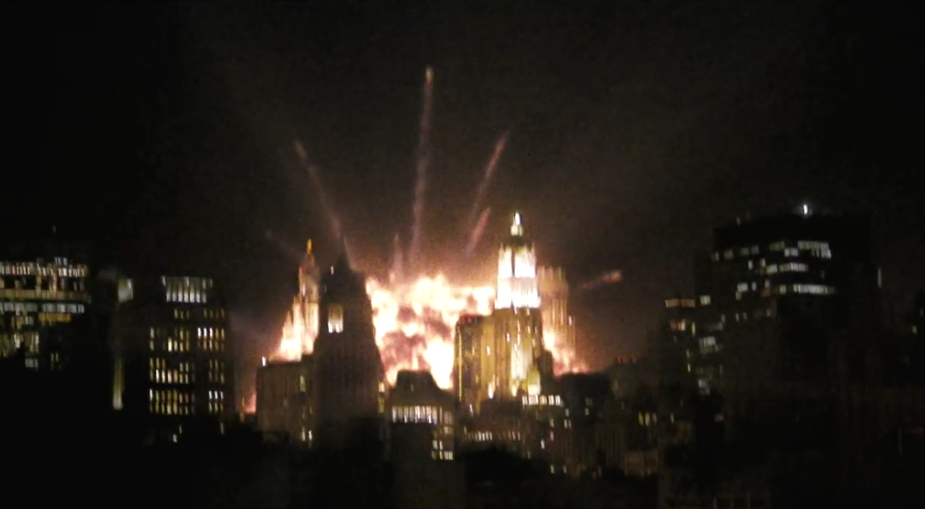 Cloverfield replaces geopolitical commentary with socioeconomic commentary, which probably isn’t purposeful but which comes off well enough. Rob’s apartment is in Manhattan and looks to be the single biggest apartment in the world; goodness knows how many of his party guests, presumably of the same social stratum, survive the night. The small group of survivors, by now limited to Rob, Hud, and Lily (Jessica Lucas), finally makes their way to the abandoned section of Manhattan where her apartment is. To get into her building, they have to go up through the one next to hers, as they’ve fallen together. In the lobby they see the remains of a chandelier. Before the monster, this was an obviously opulent place to live. Now it’s the place where they take the elevator as far as it will go before walking out onto the exterior of one building to get inside the other. The movie depicts the monster’s disruption of everything, but for us in the audience it is primarily the disruption of the urban haute bourgeoisie. Cloverfield doesn’t push this reading very far, but it’s certainly there.